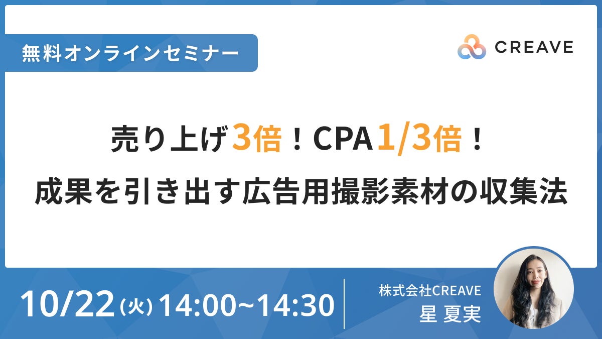 クリエイターとの共創を通じて企業のマーケティング課題を解決する、株式会社CREAVE(本社:東京都千代田区、代表取締役社長:中村真奈、以下 CREAVE)は、10月22日(火)に広告代理店様・SNS広告担当者様に向けた無料オンラインセミナー『売上3倍!CPA1/3!成果を引き出すSNS広告用撮影素材の収集法』を開催します。