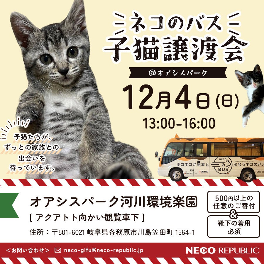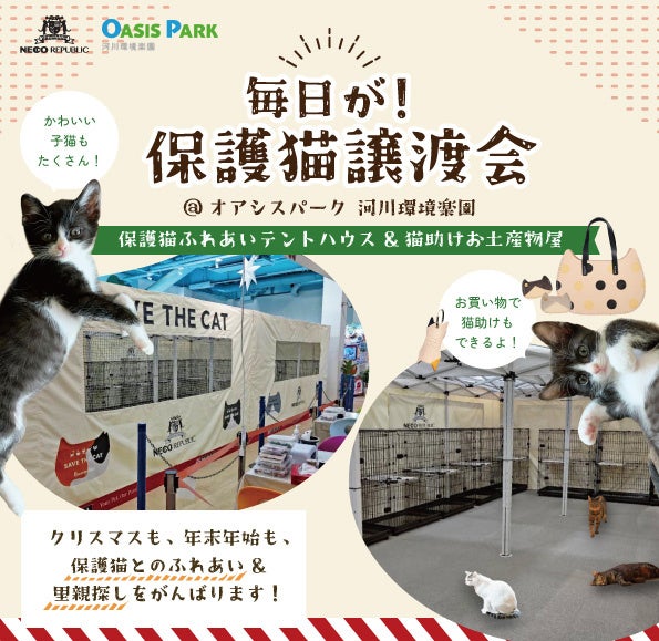 殺処分ゼロを目指して全国で9拠点、保護猫カフェや保護猫施設を運営する株式会社ネコリパブリック(所在地:東京都台東区、代表取締役:河瀬麻花)は、12月3日(土)~1月29日(日)、パーキングエリアも直結している公園「オアシスパーク 河川環境楽園」にて保護猫譲渡会を期間中毎日開催いたします。