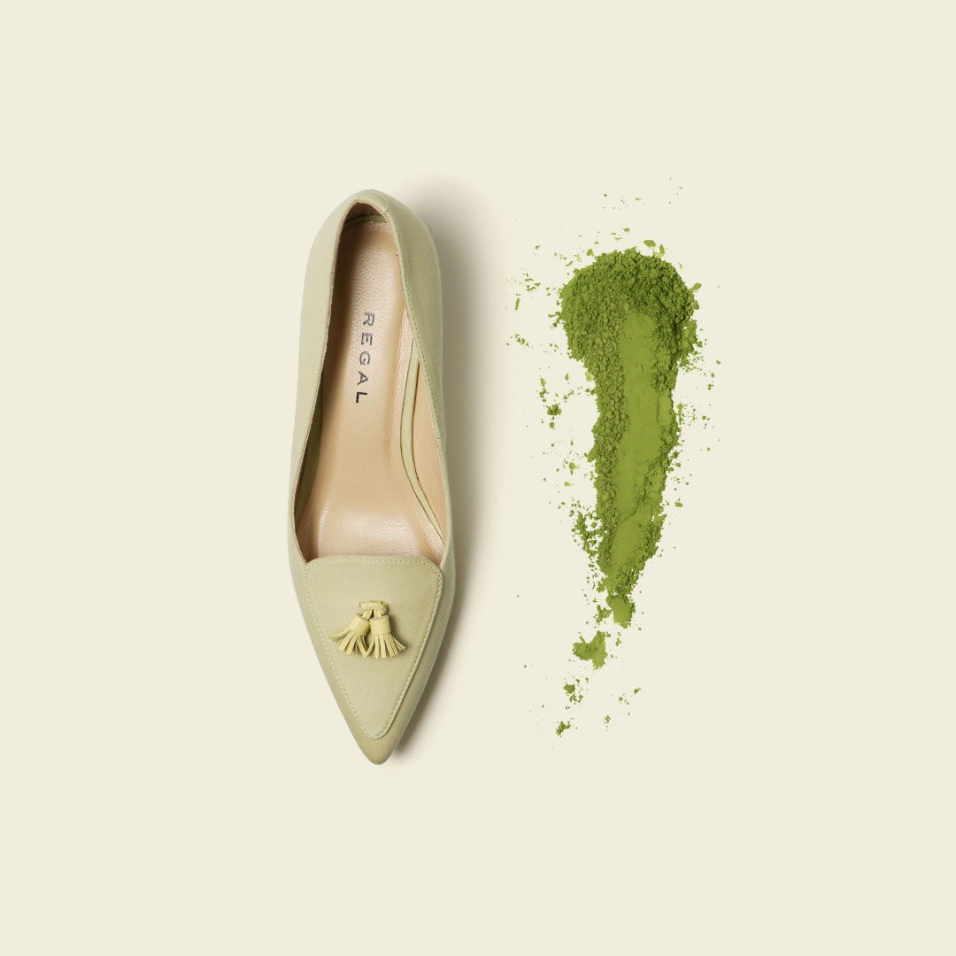 植物由来の優しい色合いを存分に活かすためにパンプスのデザインを採用。プレーンにはエキナセア、タッセルには抹茶、フラットにはブルーベリーと、3つのデザインに合わせてそれぞれ別の原料から抽出された染料を使用しています。