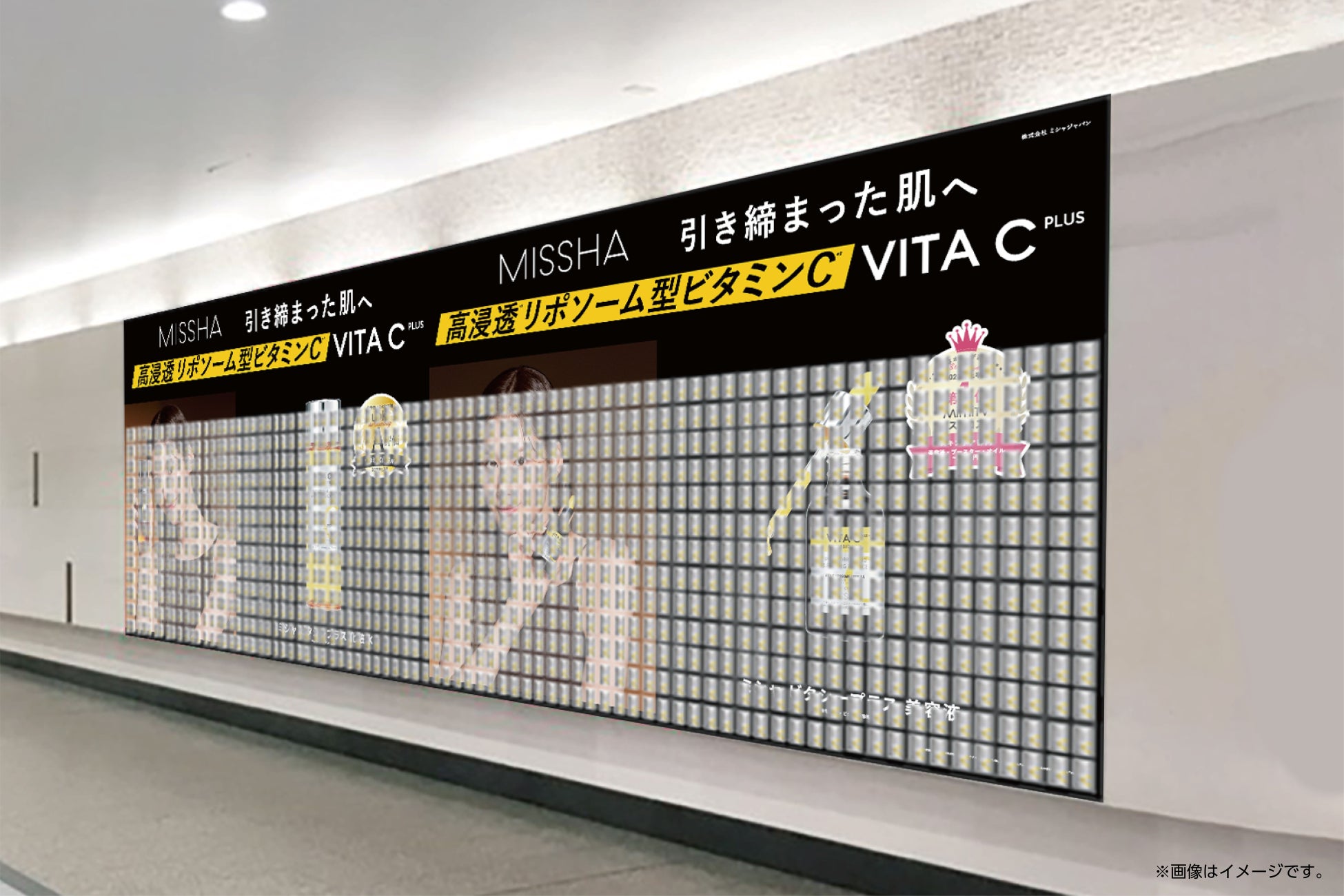 【第三弾】ミシャ ミューズ TWICE SANAの広告が大阪に出現!リポソーム型ビタミンC*¹「ミシャ ビタCプラス シリーズ」のサンプルを剥がしてもらえるピールオフ広告