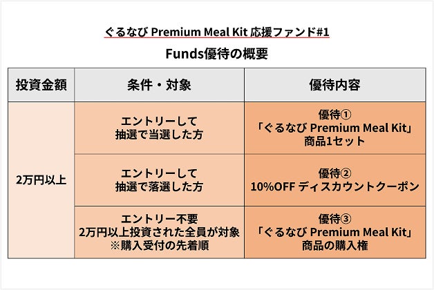 また、本ファンドでは、一定の条件を満たされた方の中から抽選で「ぐるなび Premium Meal Kit (プレミアムミールキット) 」の商品を進呈させていただく等のFunds優待をご用意いたします。優待の詳細につきましては、後半の<優待について>およびファンド詳細ページ( https://funds.jp/fund/detail/gnavimealkit01 )をご確認ください。