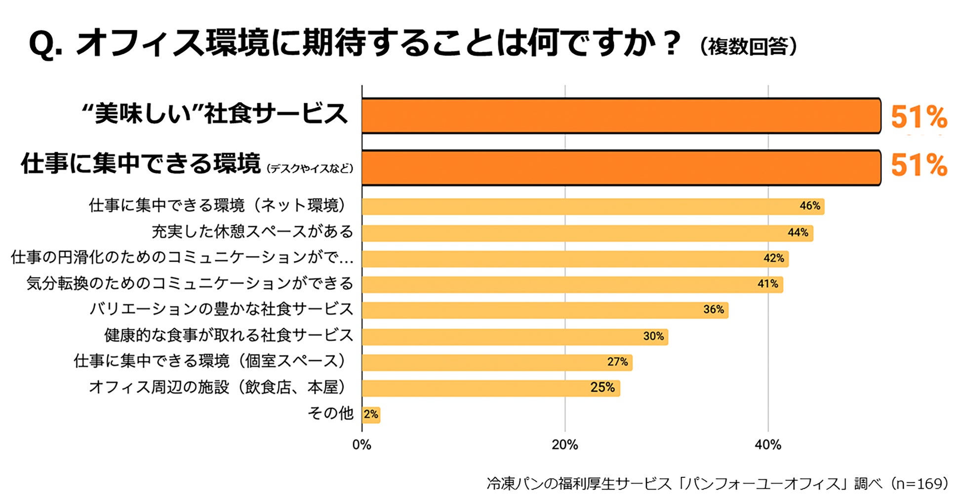 ・オフィス環境に期待するのは「”美味しい”社食サービス」とイスなどの「仕事に集中できる環境」