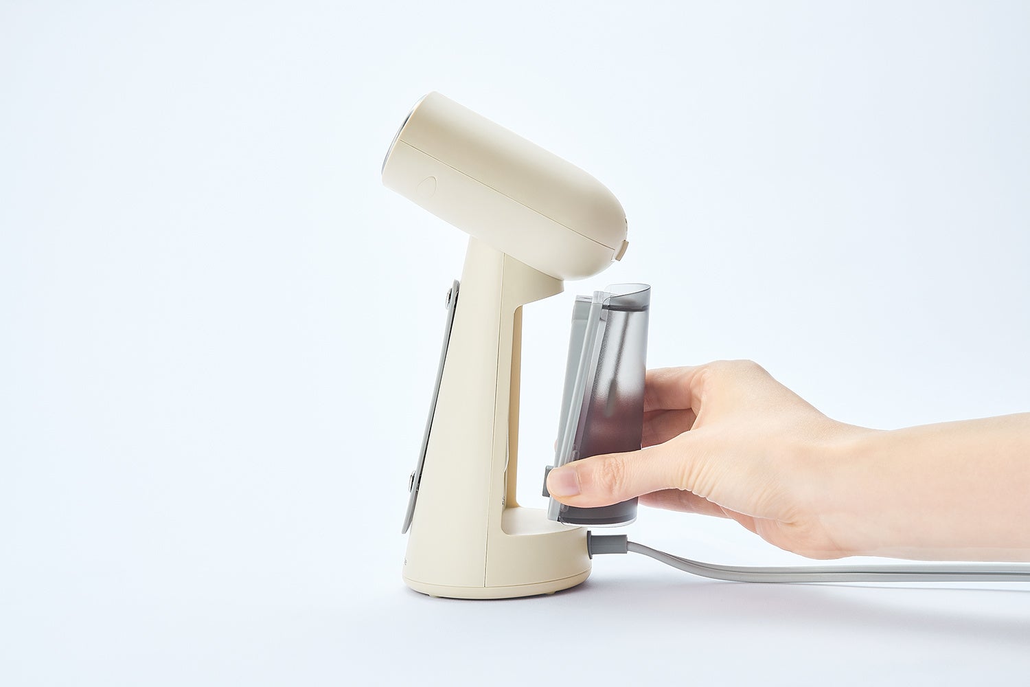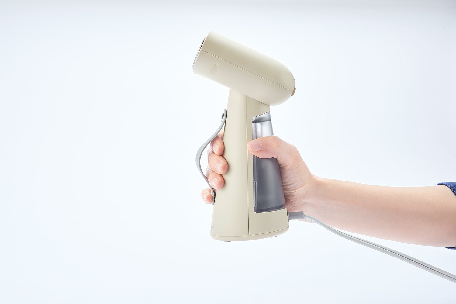 本体は約500g(電源コード含まず)の軽さ。連続使用時間は8分。コンパクトでもしっかりシワをのばせ、腕も疲れにくいので、衣類をハンガーにかけたまま使えます。立ち上がりが約25秒なので、時間のないときにもすぐに使用可能。握りやすい太さに加え、本体にバンドがついているので安定して動かせます。