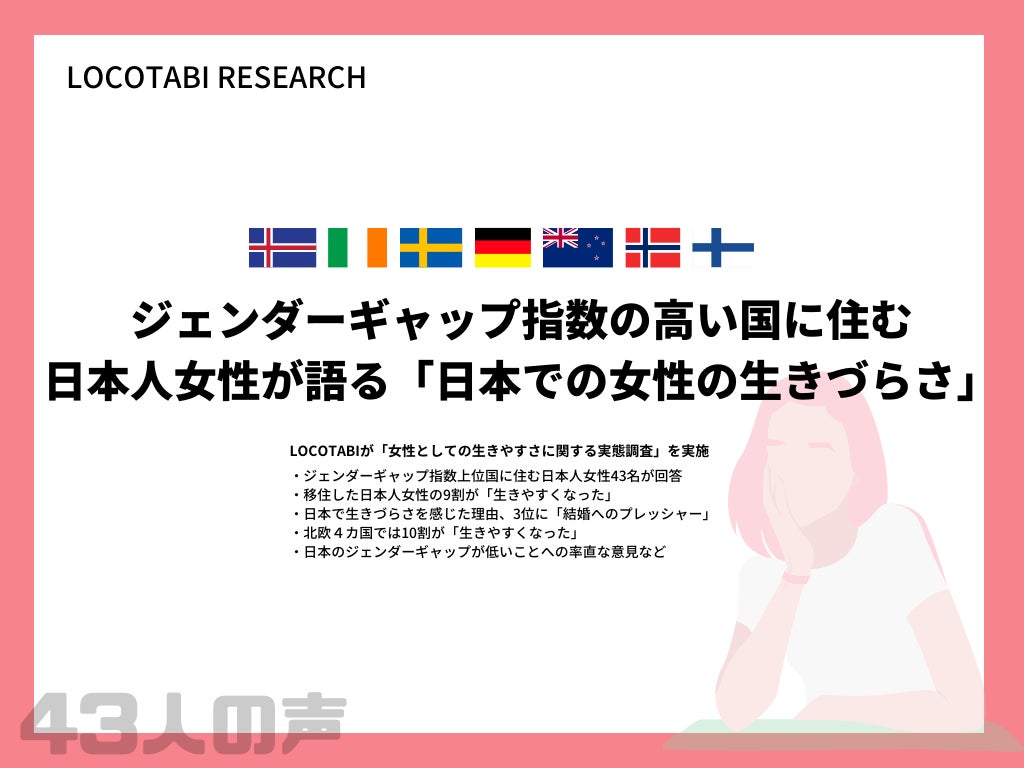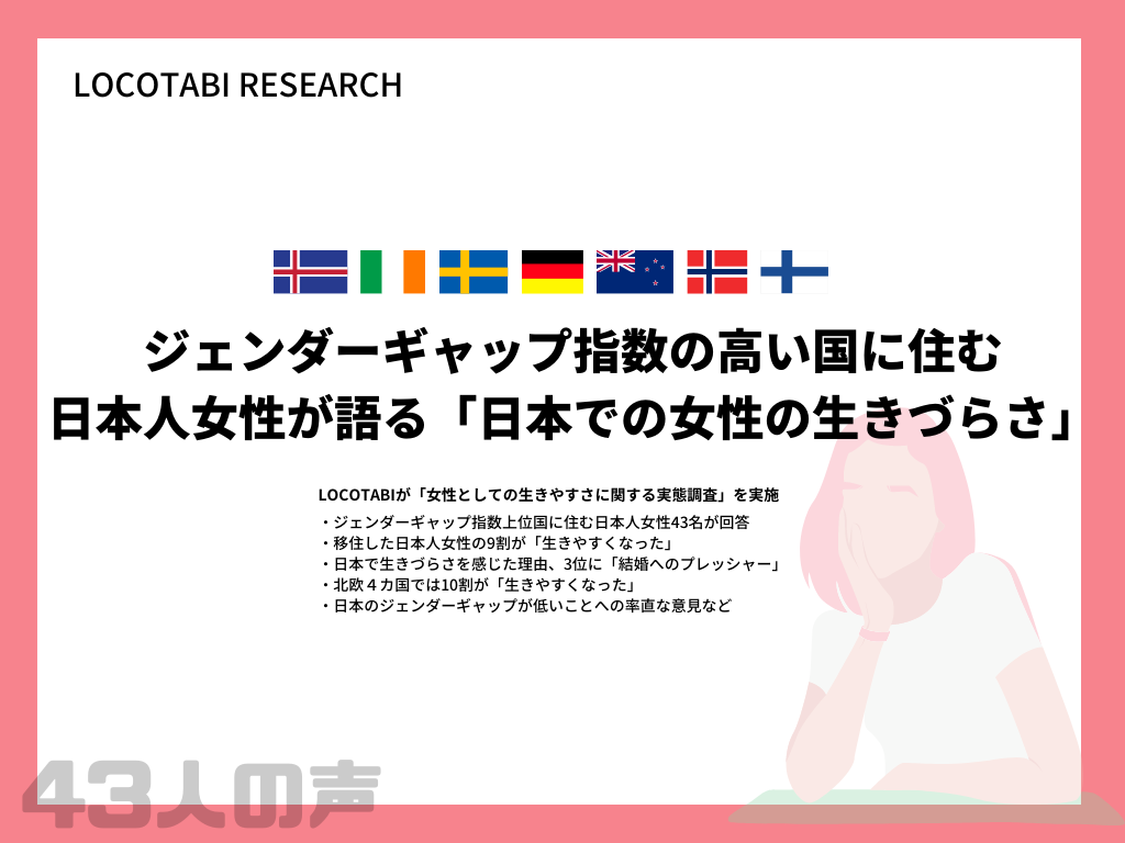 日本のジェンダーギャップ指数の慢性的な低さに関する報道が増えているなか、「海外の方がいい」「日本は遅れている」と言った声を多く耳にするようになった昨今。本ランキング下位の事実がある一方で、果たしてその実態はどうなのか。世界176カ国5万人以上の日本人が登録するロコタビでは、実際にジェンダーギャップ指数ランキング上位の国に移り住んだ日本人女性を対象に調査を実施し、日本と他国双方での居住体験及びその過程で感じた意見を集めることで、日本のジェンダーギャップの課題に対するヒントの顕在化を図った。