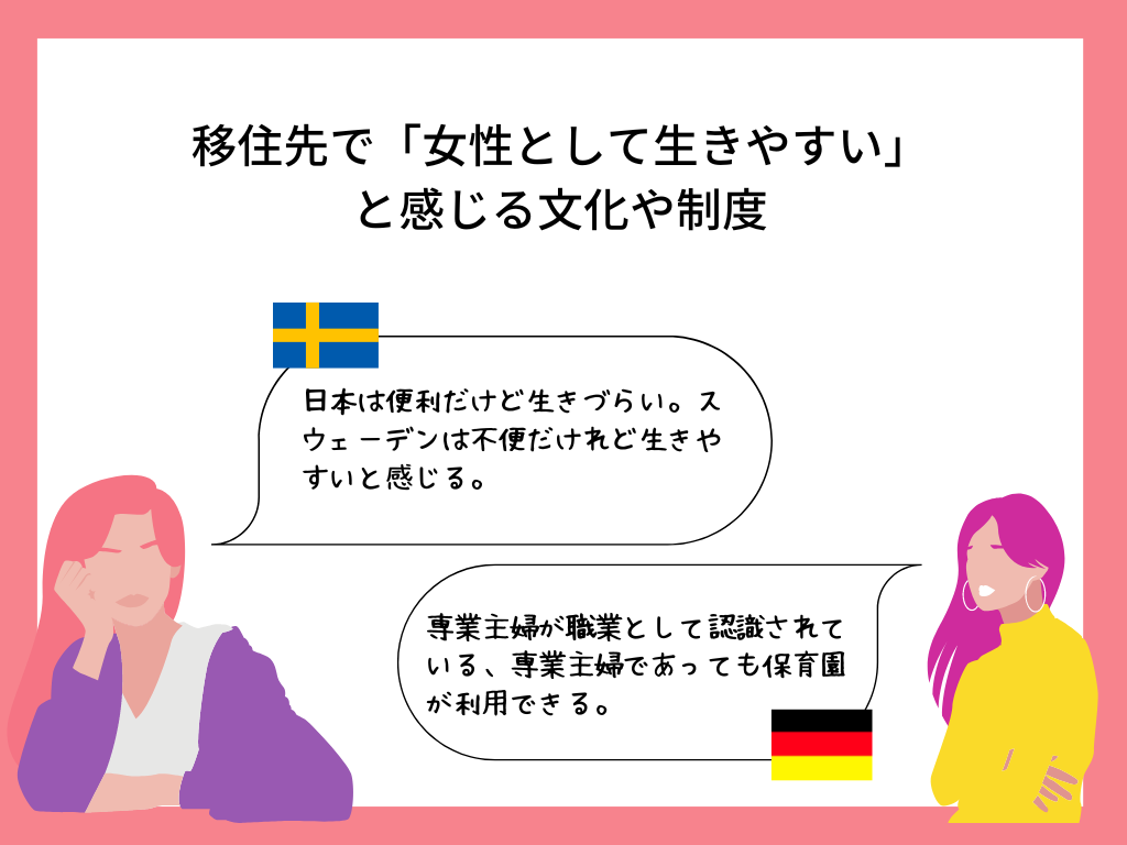- 移住先で「女性として生きやすい」と感じる文化や制度