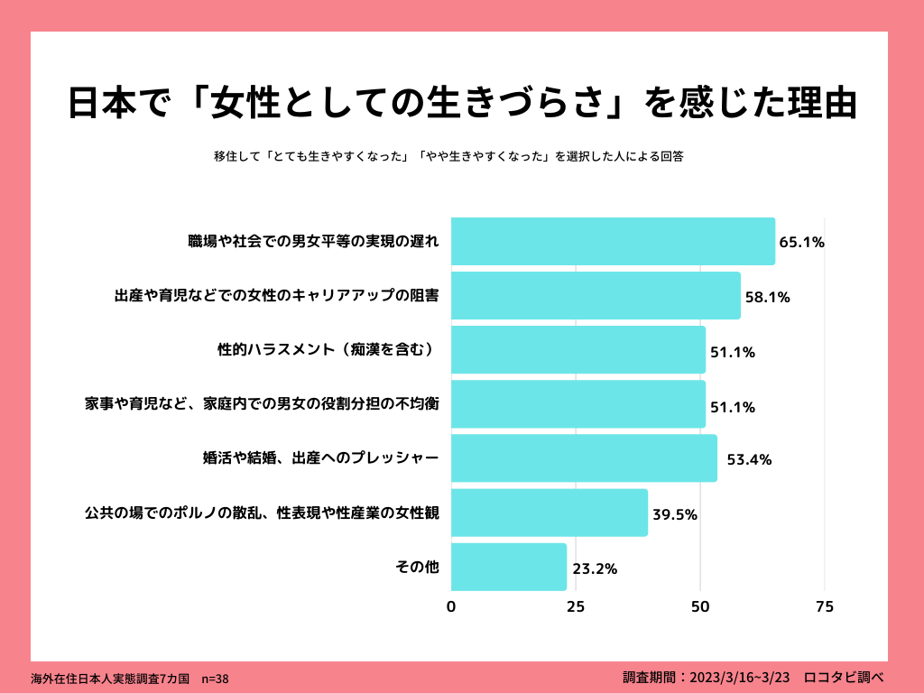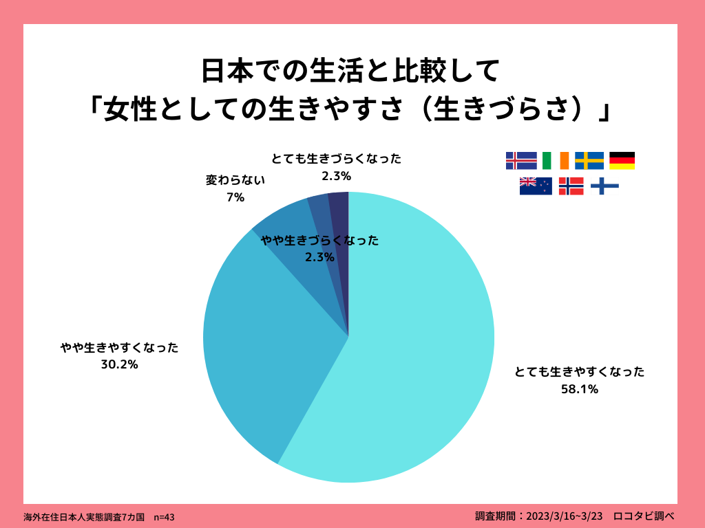 ジェンダーギャップ指数上位国(アイスランド、アイルランド、スウェーデン、ドイツ、ニュージーランド、ノルウェー、フィンランド)に住む日本人女性に、日本での生活と比較して「女性としての生きやすさ(生きづらさ)」を質問したところ、「とても生きやすくなった」(58.1%)、「やや生きやすくなった」(30.2%)、「変わらない」(7%)、「やや生きづらくなった」(2.3%)、「とても生きづらくなった」(2.3%)だった。