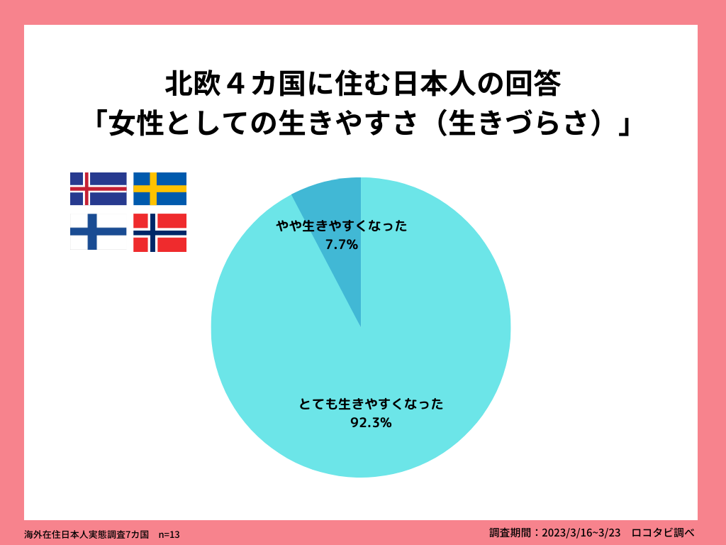 国別でみると北欧4カ国(アイスランド、スウェーデン、フィンランド、ノルウェー)の結果が際立った。日本での生活と比較して「女性としての生きやすさ(生きづらさ)」については「とても生きやすくなった」(92.3%)、「やや生きやすくなった」(7.7%)と10割の人が、日本での生活よりも生きやすくなったと回答した。