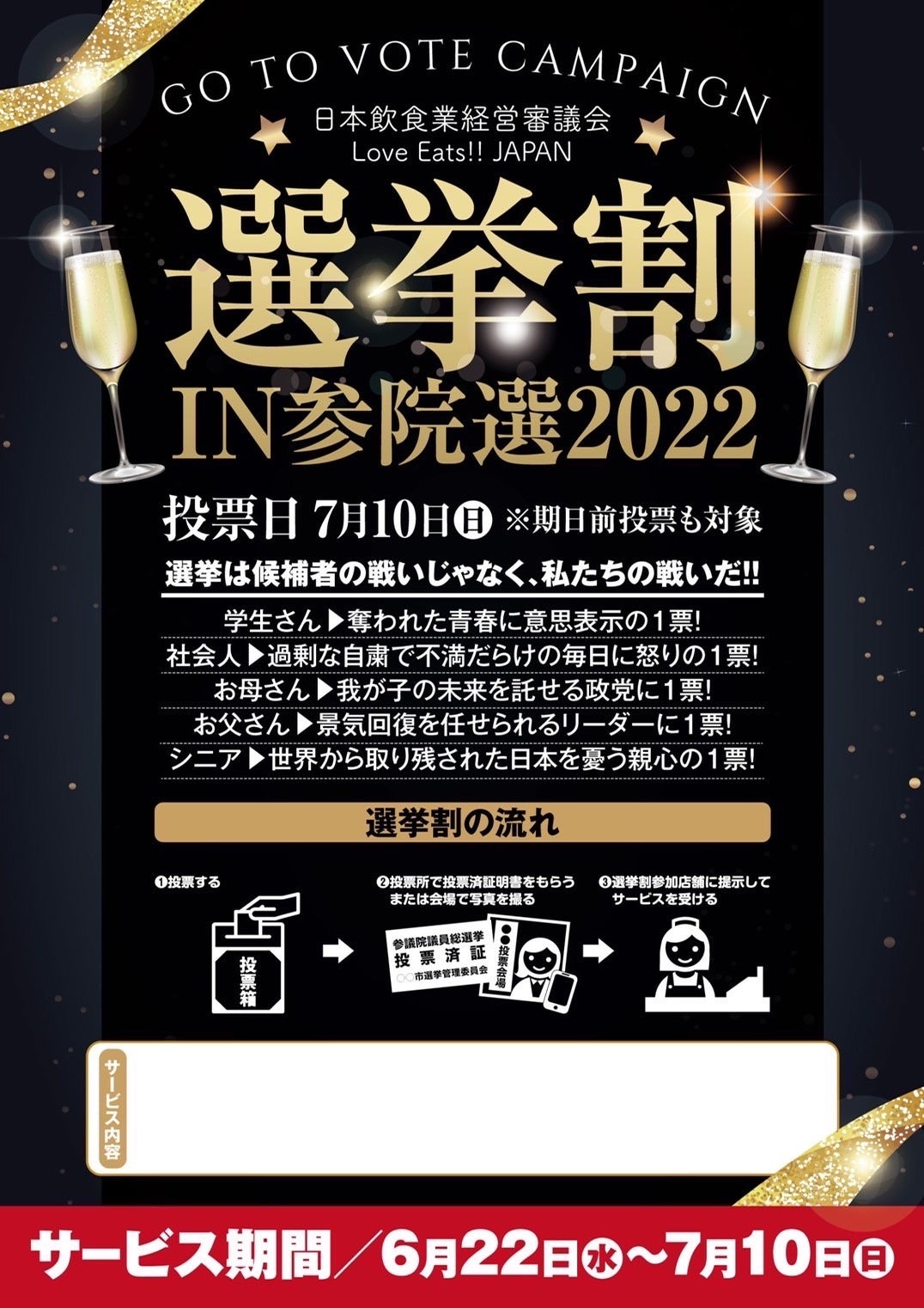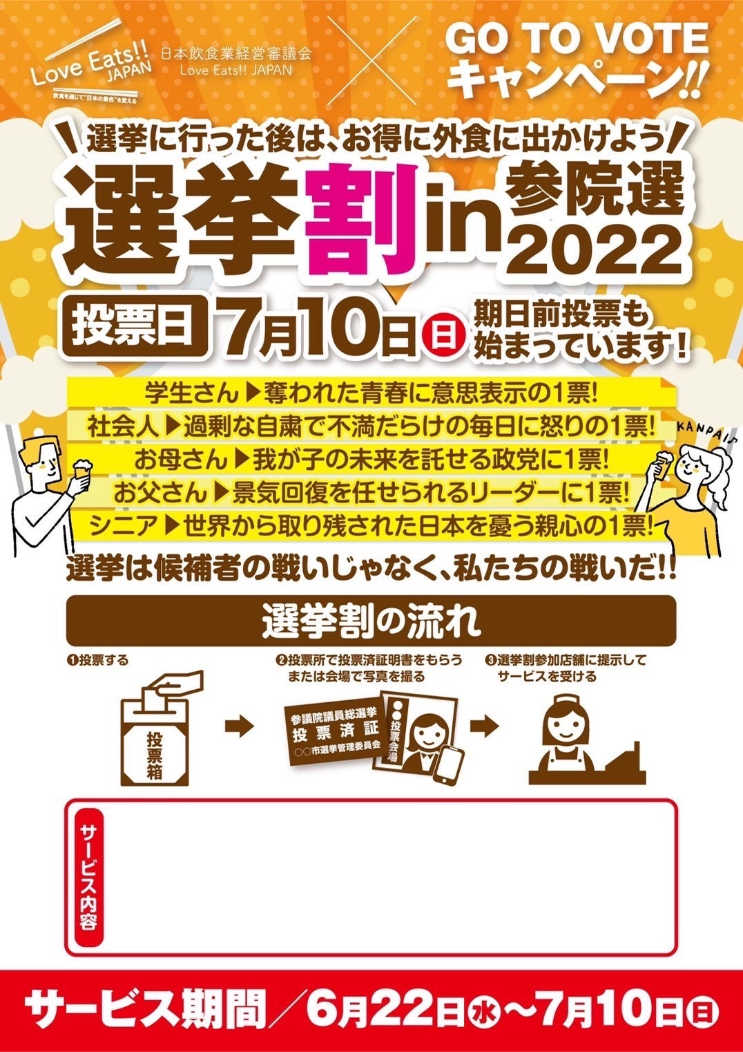 利用方法:以下のポスターが掲示されている選挙割「飲食GO TO VOTE キャンペーン」参加店舗にて、投票済証明書または今回の選挙だと分かる投票所の写真を店舗で提示していただくと、店舗ごとにそれぞれ特色のある割引などサービスが受けられます。サービスの内容は、店舗ごとに異なります。詳しくは店頭に掲示されているポスターをご覧ください。