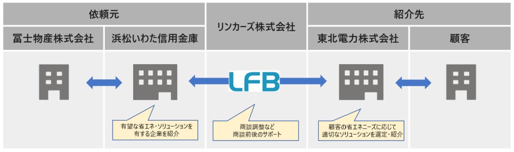 東北電力株式会社(*4)では、顧客の節電・省エネニーズを踏まえ、リンカーズが提供する「LFB」を通じた広域連携を活用して浜松いわた信用金庫(*5)の顧客である冨士物産株式会社(*6)の「遮熱・断熱により省エネに効果のある商材」を紹介することにより、新たな商談が創出されました。