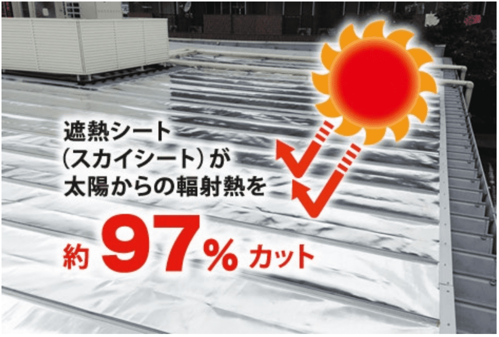 断熱材だけでは防げない、輻射熱を 約97%カットする遮熱材。工場などの屋根や壁に使用することで、夏の太陽の輻射熱による建物の温度上昇を抑え、体感温度を下げることができます。