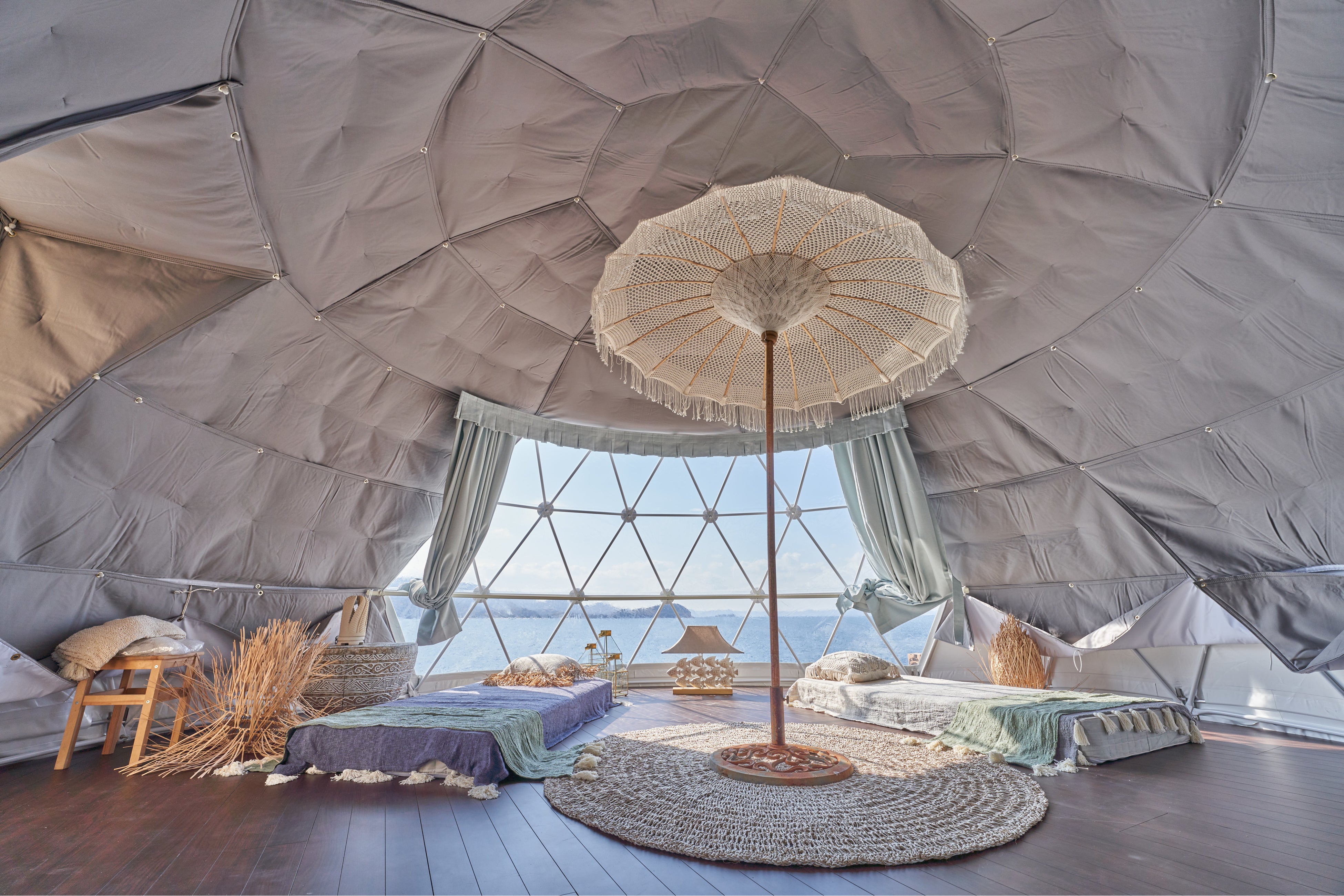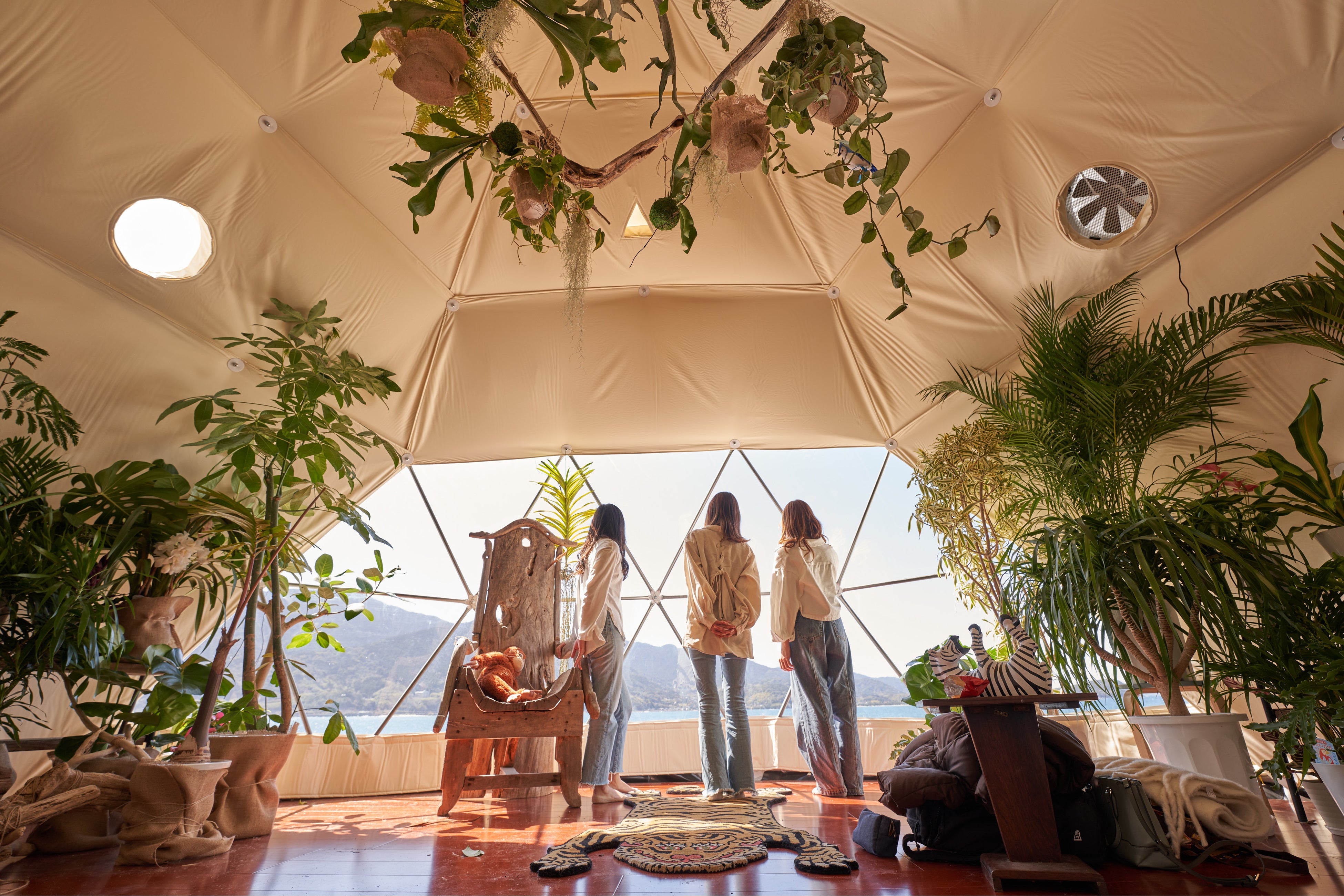 施設のデザインは、九州大学大学院芸術工学研究院 井上滋樹教授の監修で、「Gifts from The Nature=自然からの贈り物」というテーマで、地域のアーティスト、環境活動家とつくられたドームテントが4つある。
