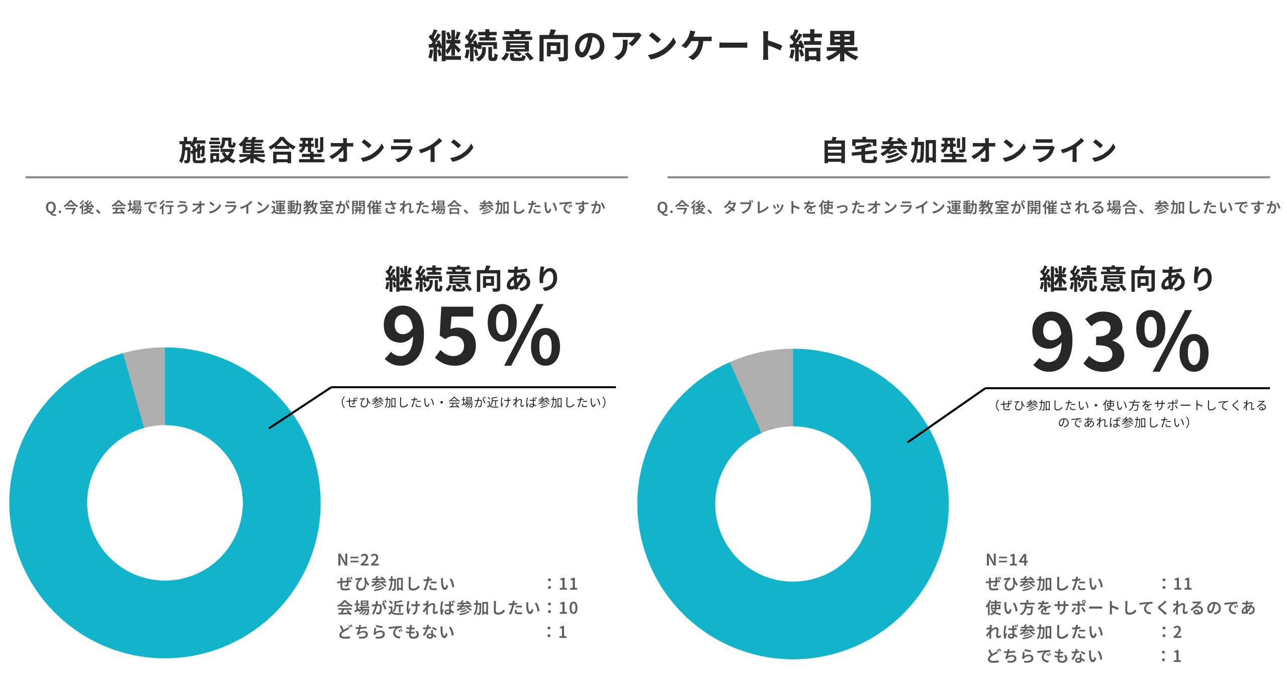 実証終了後のアンケートでは、施設集合型・自宅参加型ともに「非常に満足」「概ね満足」の合計が全体の約9割にのぼりました。「対面と変わらず運動できた」「画面越しが新鮮で楽しめた」「自宅でも双方向でコーチと会話しながらできるので運動の質が高い」「口腔体操の時、画面の先生に向かって声を出すのでいつもより大きな声が出た」といった声が寄せられ、継続意向においても施設集合型・自宅参加型ともに約9割が「参加したい」と回答しています。