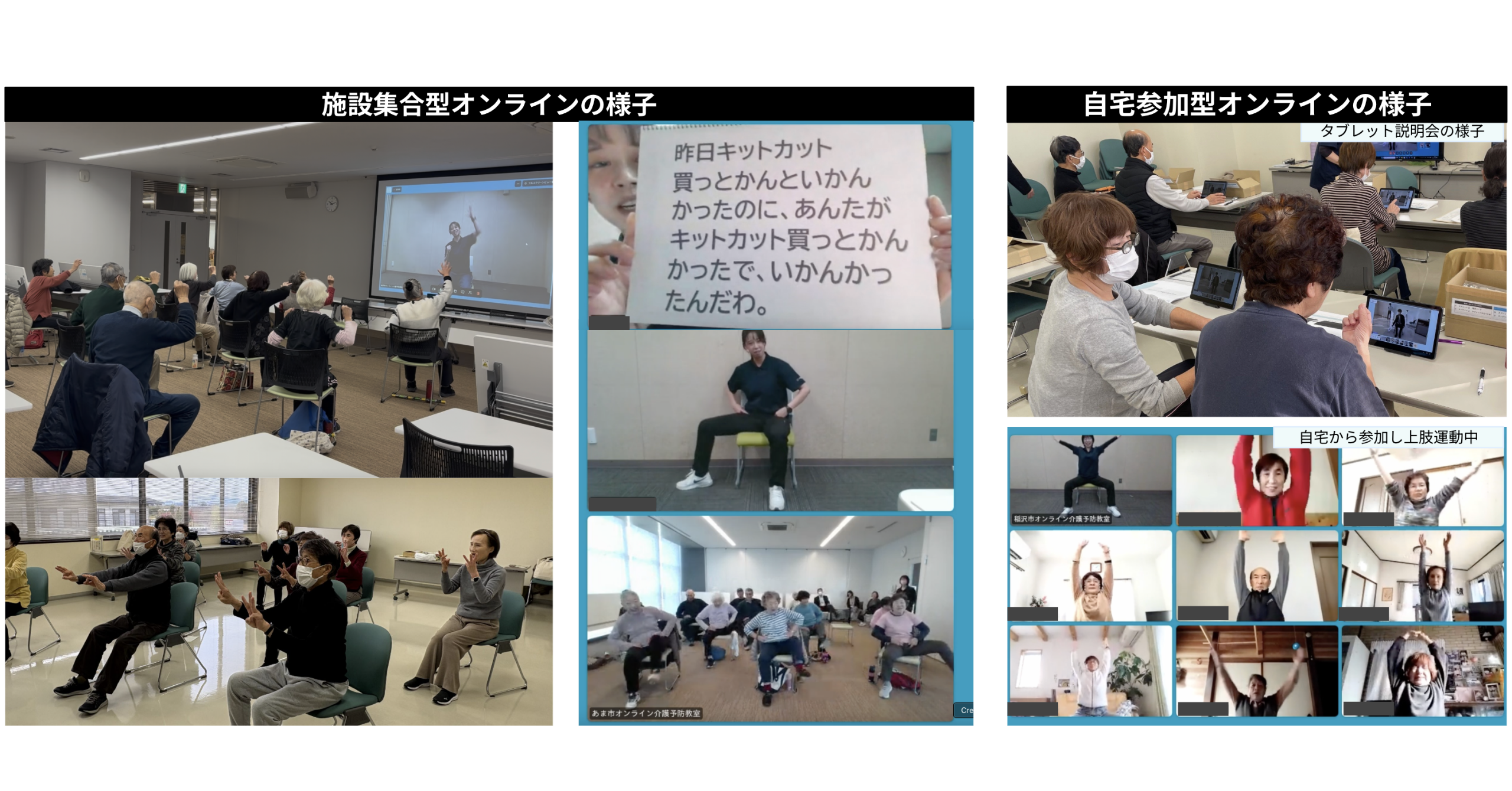 従来の対面型で行われる運動指導に加え、会場のテレビモニターを通じてリハビリ専門職がリアルタイムで運動指導を行う「施設集合型オンライン」と、自宅からタブレット端末を使い参加する「自宅参加型オンライン」の2形式を導入し、各自治体で計8〜9回(1回60分)の教室を開催しました。また初回・最終回にはモーションAIによる身体機能測定(片脚立位・5回立ち座り)を実施し、取り組みの効果を客観的に把握しました。