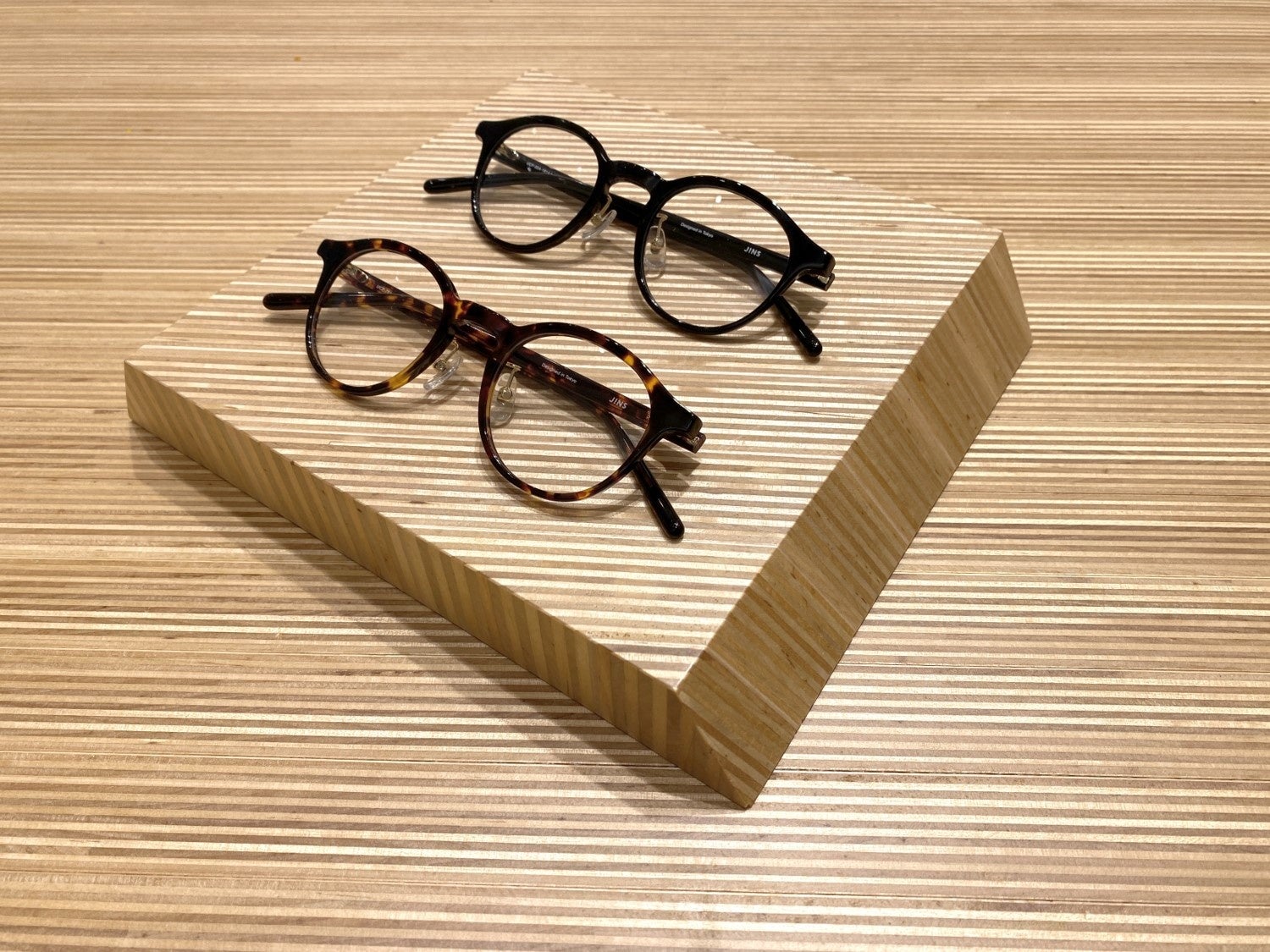 オープンを記念して、同店でしか手に入らない限定商品をご用意。アメリカや中国など、海外のJINSだけで販売している海外トレンドを取り入れたフレームを特別に逆輸入しました。ラインアップは、インパクトのある太い縁が特長のスクエアとウエリントンに加え、程よく個性的な多角形の計3型。アイウエアの最旬カラーであるクリアとブラックの艶のあるアセテート素材を採用し、カラーレンズとの相性も抜群。洋服をコーディネートする感覚で、フレームとカラーレンズとの組み合わせを楽しむこともできます。