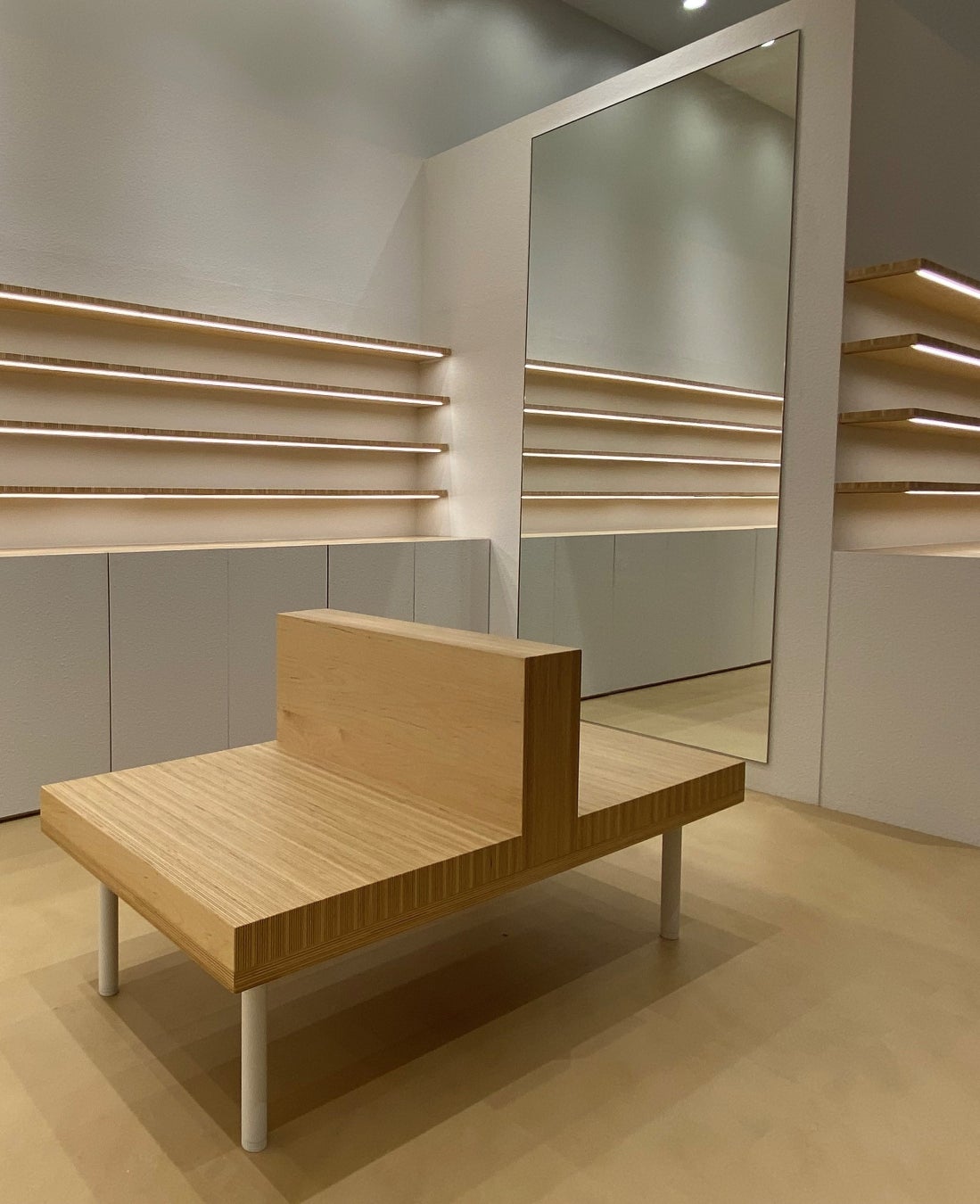 新進気鋭の建築家・髙濱史子氏が手掛けた店内は、最旬のメガネが主役として映える、白いキャンバスのような空間。洋服のようにメガネを“着替える”体験がゆっくりと楽しめるよう、大きな全身鏡を複数配置し、近くには、お客様が選定中の商品を置けるスペース付きのベンチを設けました。鏡の前で、ご自身のその日のコーディネートやワードローブとの相性を確かめながら、あれこれとかけ替えてメガネを楽しく選べる時間をご提供します。