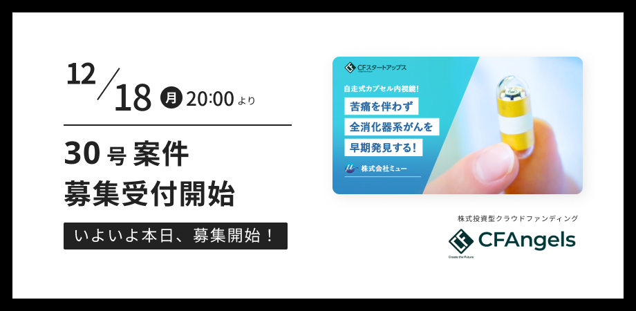 株式投資型クラウドファンディング「CF Angels」、本日12月18日(月) 20:00より第30号プロジェクト募集開始