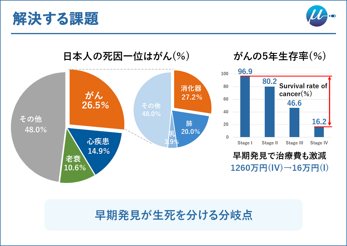 ・病気に気付いてから検査するため死亡リスクの増大や医療費の上昇などの課題をもつ「後追い治療」の現状を変え、異常感知前に定期検査でがんの早期発見を行う「予防と医療」を実現して、健康寿命の延伸、医療費削減につなげたい