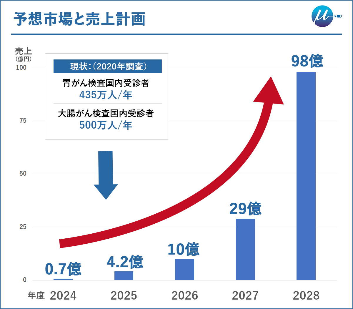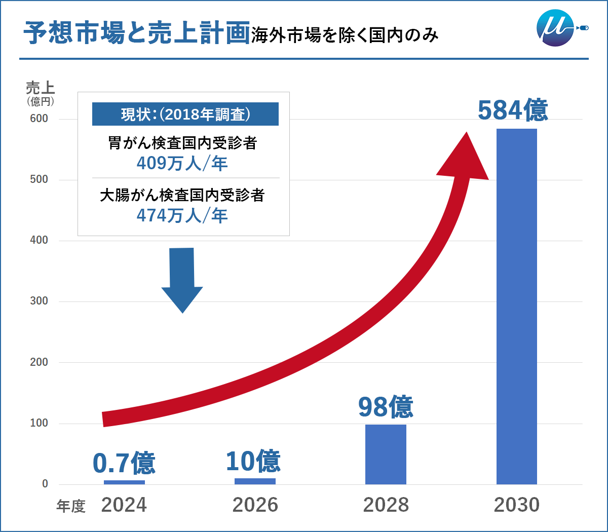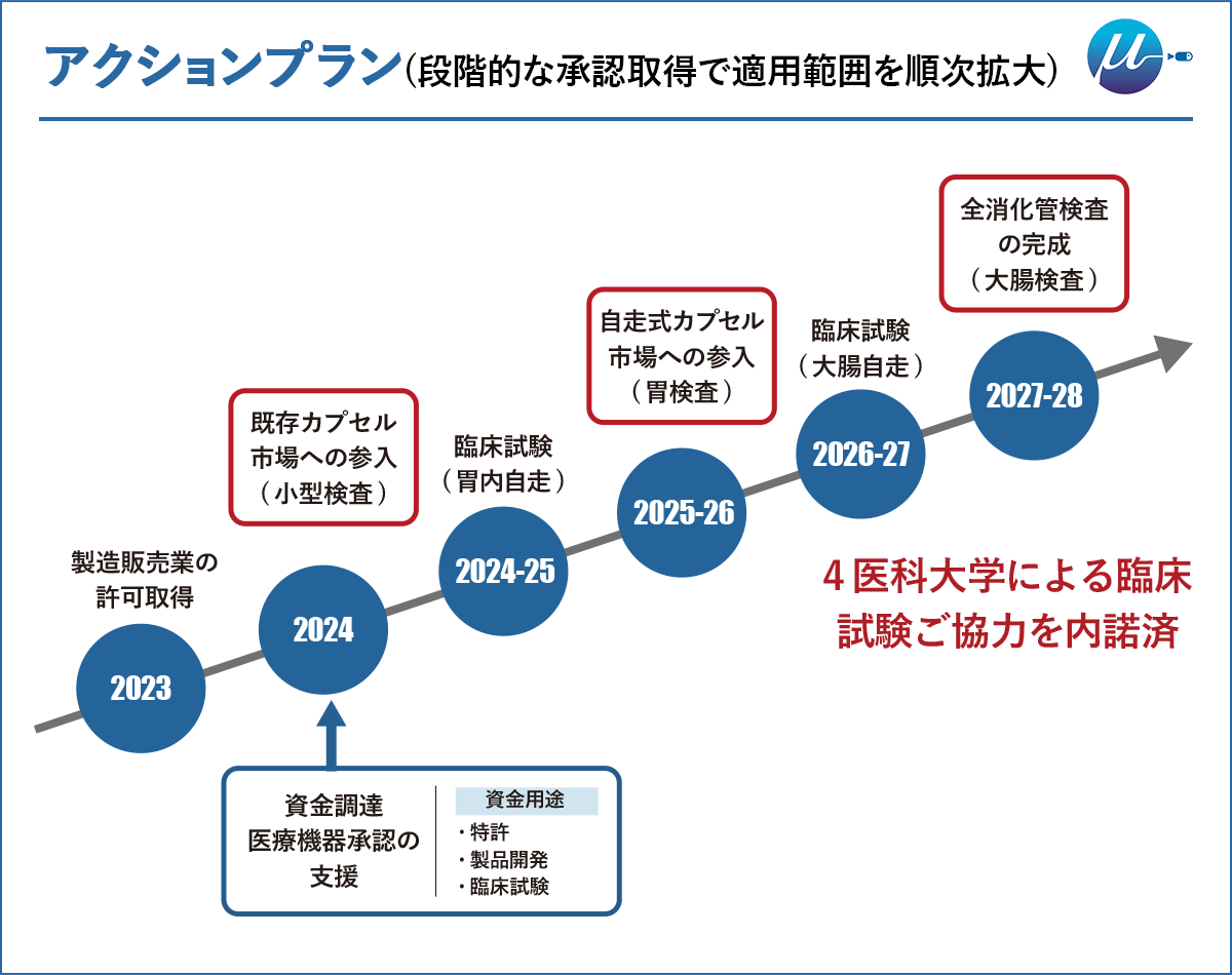 ・まずは2024年を目途に小腸検査用の既存カプセル内視鏡の承認を取得して販売を開始し、2025年~26年には胃検査を対象とした自走式カプセル内視鏡の市場に参入。更に2027年~28年を目標に自走式カプセル内視鏡による大腸検査をスタートさせ全消化管検査を完成させる計画です。