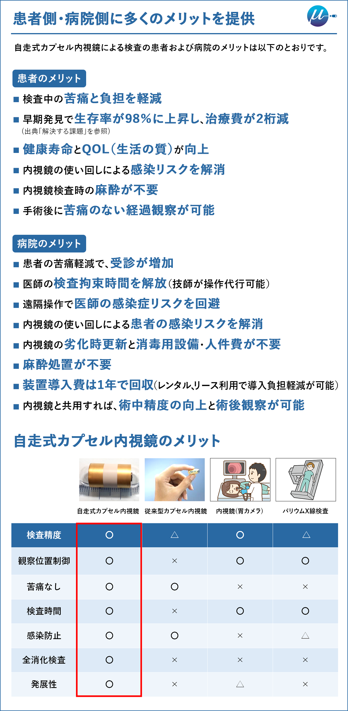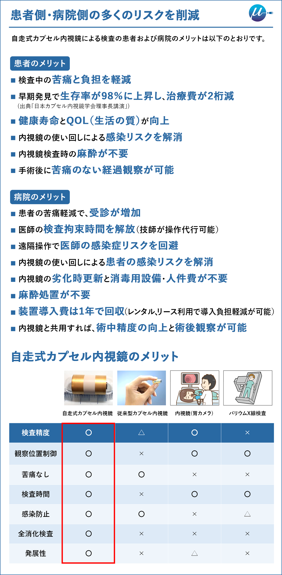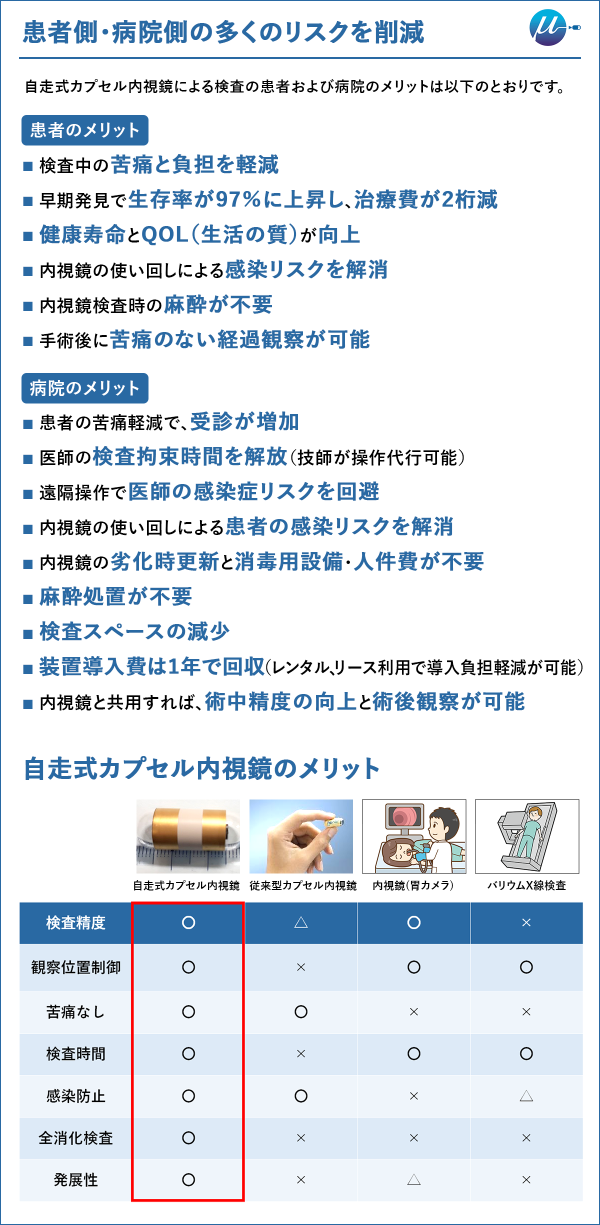 ・さらに、「自走式カプセル内視鏡」を用いた検査により、使いまわしによる患者への感染や、遠隔診断が可能となることにより医師への感染も防ぐことが期待されます。