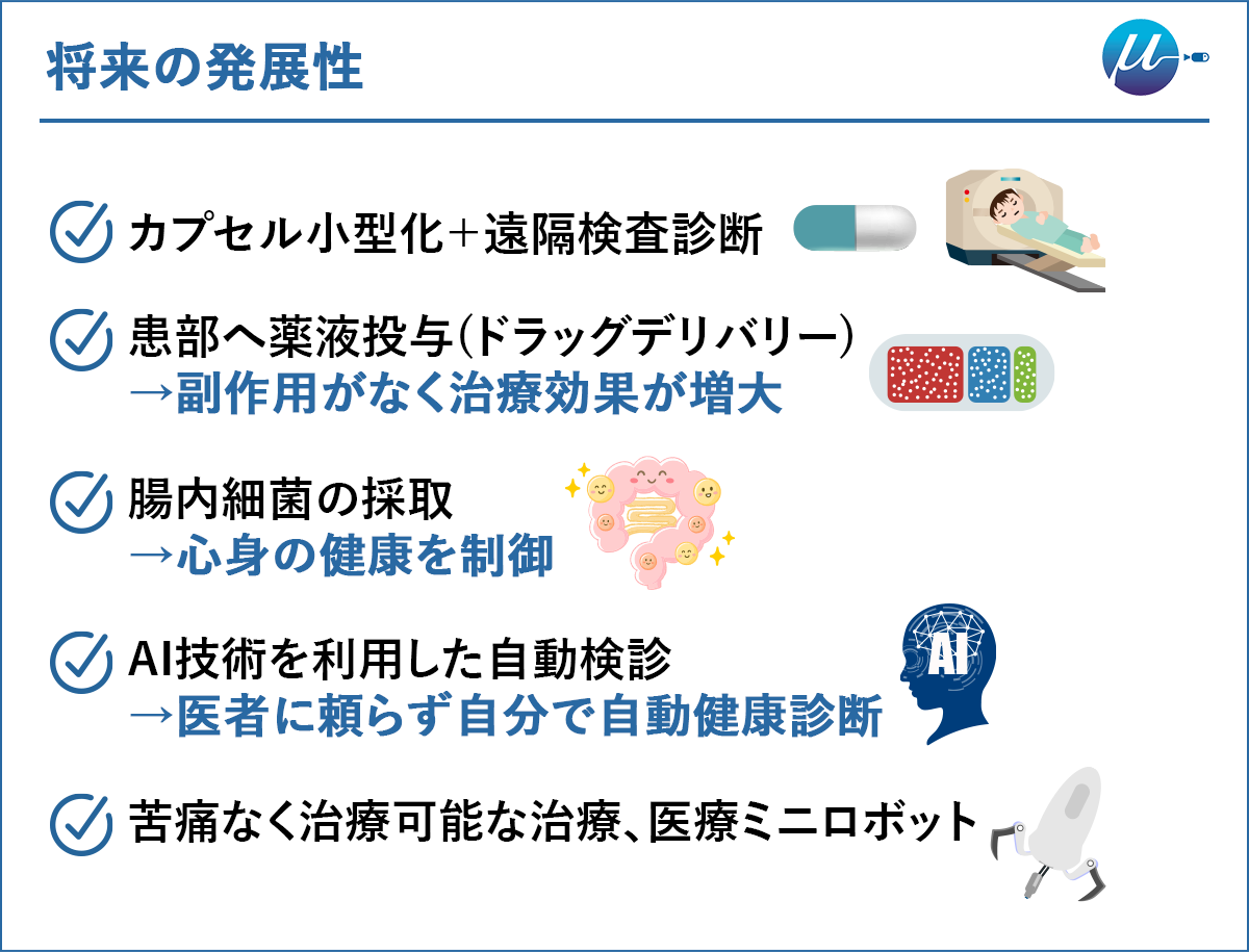・将来的に、自走式カプセル内視鏡は患部への薬液投与、腸内細菌の採取、AI技術を利用した自動検診などへと活用範囲が拡大していくと期待されます。