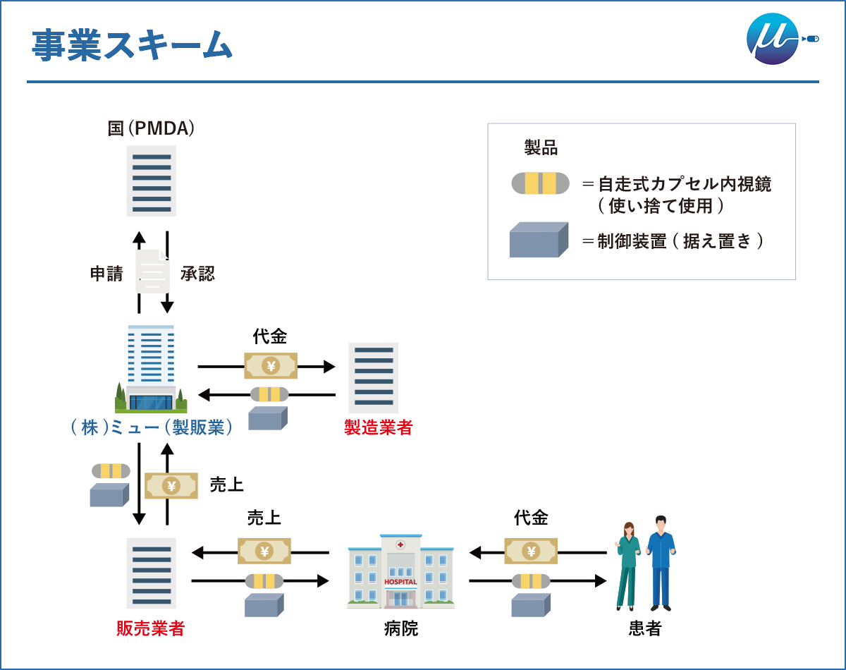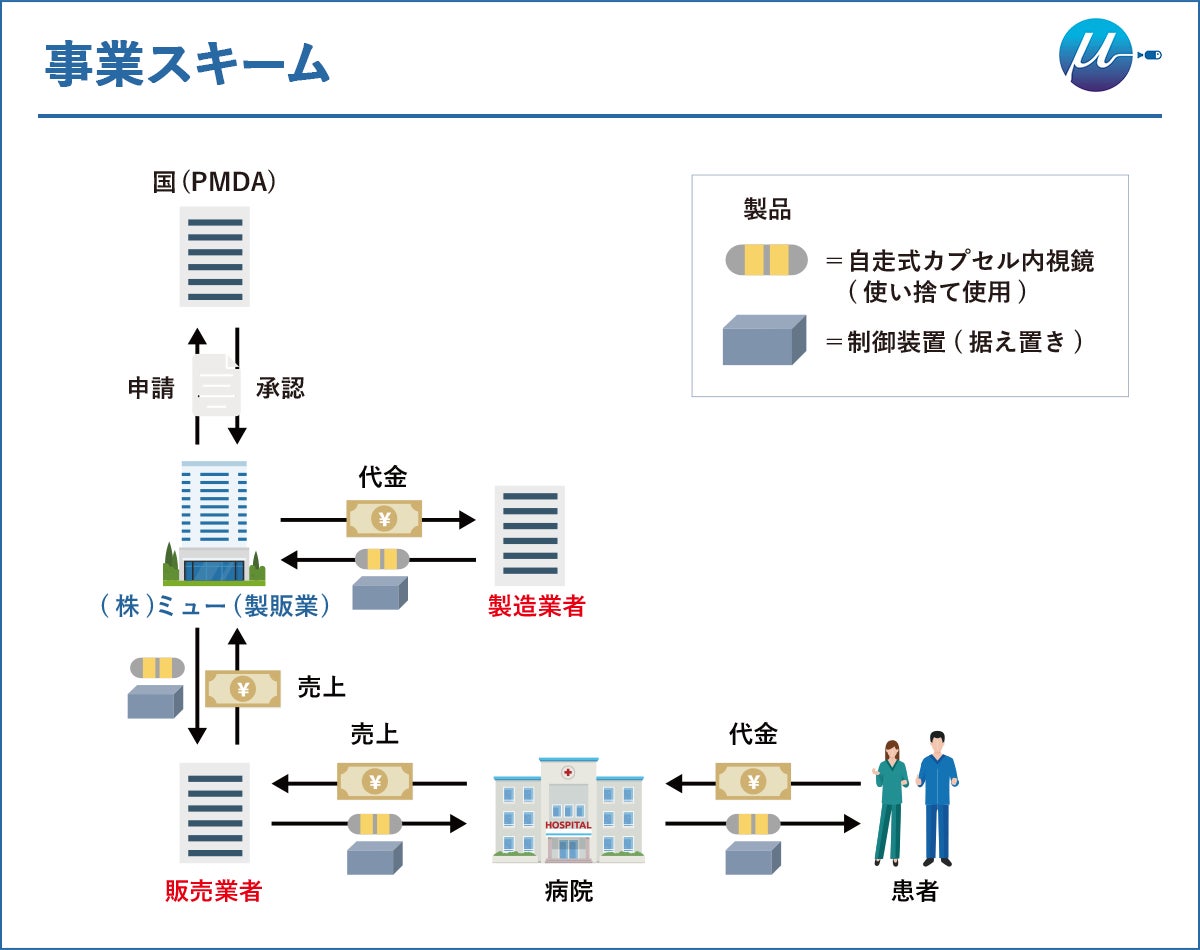 ・同社は自走式カプセル内視鏡および制御装置のさらなる研究開発を行い、製造を製造業者に委託し、販売業者を通して医療機関に提供します。ユーザーとなる医療機関様については、臨床試験に協力頂く医療機関様から順次全国の医療機関様へと展開していく計画です。