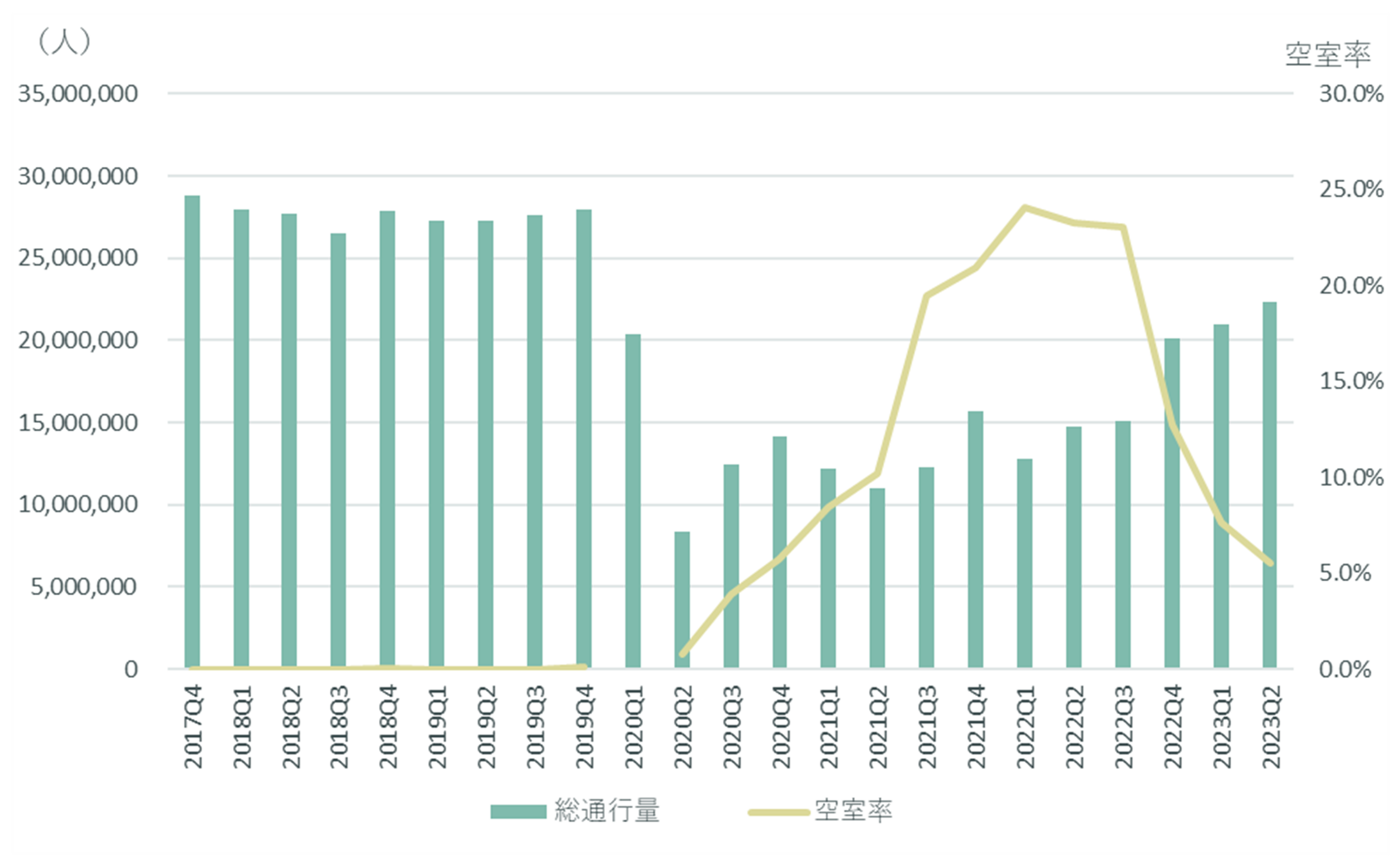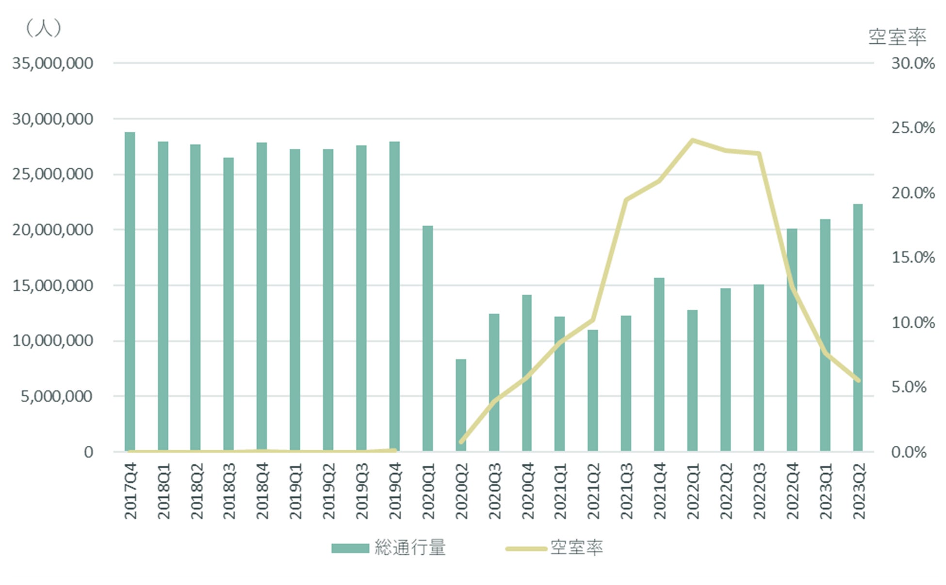 ・2022年Q4以降、心斎橋筋商店街の通行量の回復が堅調になるにつれ空室率に改善の兆しがみられ、直近2023年Q2では5.5%の水準まで回復した。