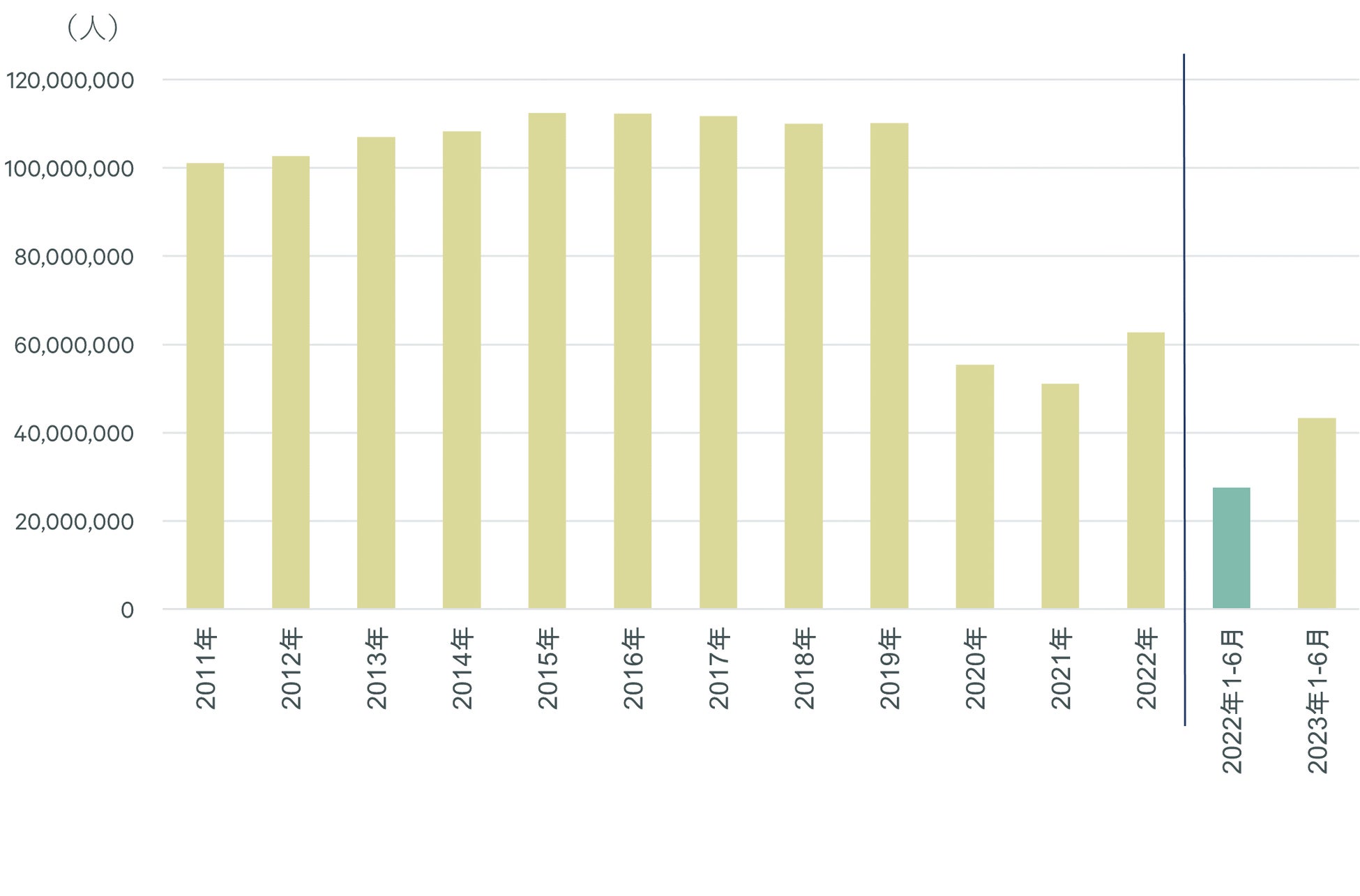 ・2020年以降は新型コロナウィルス感染拡大の影響により大幅に減少し、2021年の年間総通行量は2019年比で46.4%となった。しかし、2022年以降は行動制限の緩和やインバウンドの受け入れ再開等により総通行量は急激な回復をみせており、2023年上半期(1-6月期)の総通行量は約4300万人と、2019年比の79.4%まで回復。前年比でみると157.3%となっており、直近1年間の回復状況が特に目立っている。