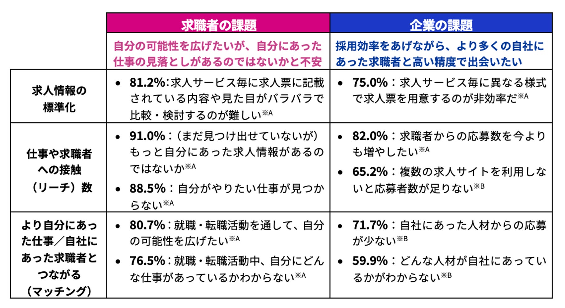 Indeedが、求職者1,200名と企業の採用担当者1,000名を対象に行った「企業の採用活動および求職者の仕事探しにおける課題調査」(※7)からは、求職者と企業がそれぞれ「求人情報の標準化」「仕事や求職者への接触数(リーチ)」「より自分にあった仕事/自社にあった求職者とつながる(マッチング)」の3つの面で、表裏一体の課題を感じていることが明らかになりました。Indeed PLUSにはこれらの課題を解決するための特徴を盛り込みました。