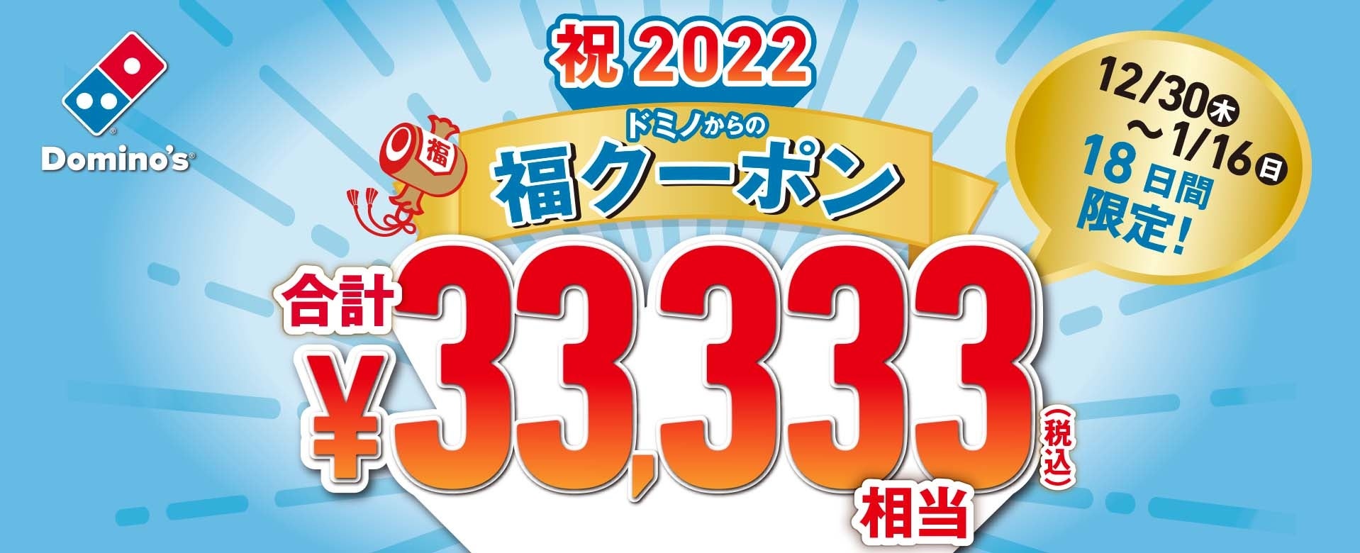 株式会社ドミノ・ピザ ジャパン(代表取締役:ジョシュア・キリムニック、本社:東京都千代田区、以下:ドミノ・ピザ)が展開する国内No.1シェアを誇る宅配ピザチェーン ドミノ・ピザは、2021年12月30日(木)から2022年1月16日(日)までの18日間限定で、合計33,333円相当がお得になる「福クーポン」をご提供します。年末年始には、是非おうちでゆっくりとドミノ・ピザをお楽しみください。