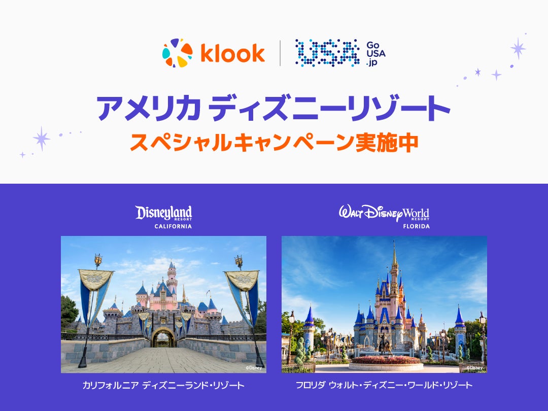 世界をリードする旅行・レジャー予約サイトKlookは、アメリカの2大ディズニーリゾート「カリフォルニア ディズニーランド・リゾート」と「フロリダ ウォルト・ディズニー・ワールド・リゾート」のキャンペーンを9月30日まで日本で開催します。本キャンペーンは、Klookと米国観光マーケティング組織「ブランドUSA」が連携し、日本のディズニーファンの皆さまにアメリカのディズニーリゾートを思い切り楽しんでいただきたいという思いから実現しました。パークチケットが最大100米ドル割引となるクーポンが当たるハズレなしのルーレットを毎月開催するほか、Klook公式SNSアカウントで限定キャンペーンも実施予定です。また、パークチケットだけでなくディズニー直営ホテルや周辺ホテル、貸切空港送迎、eSIMなど、旅行に必要なあらゆるものがKlookでお得に予約可能となります。