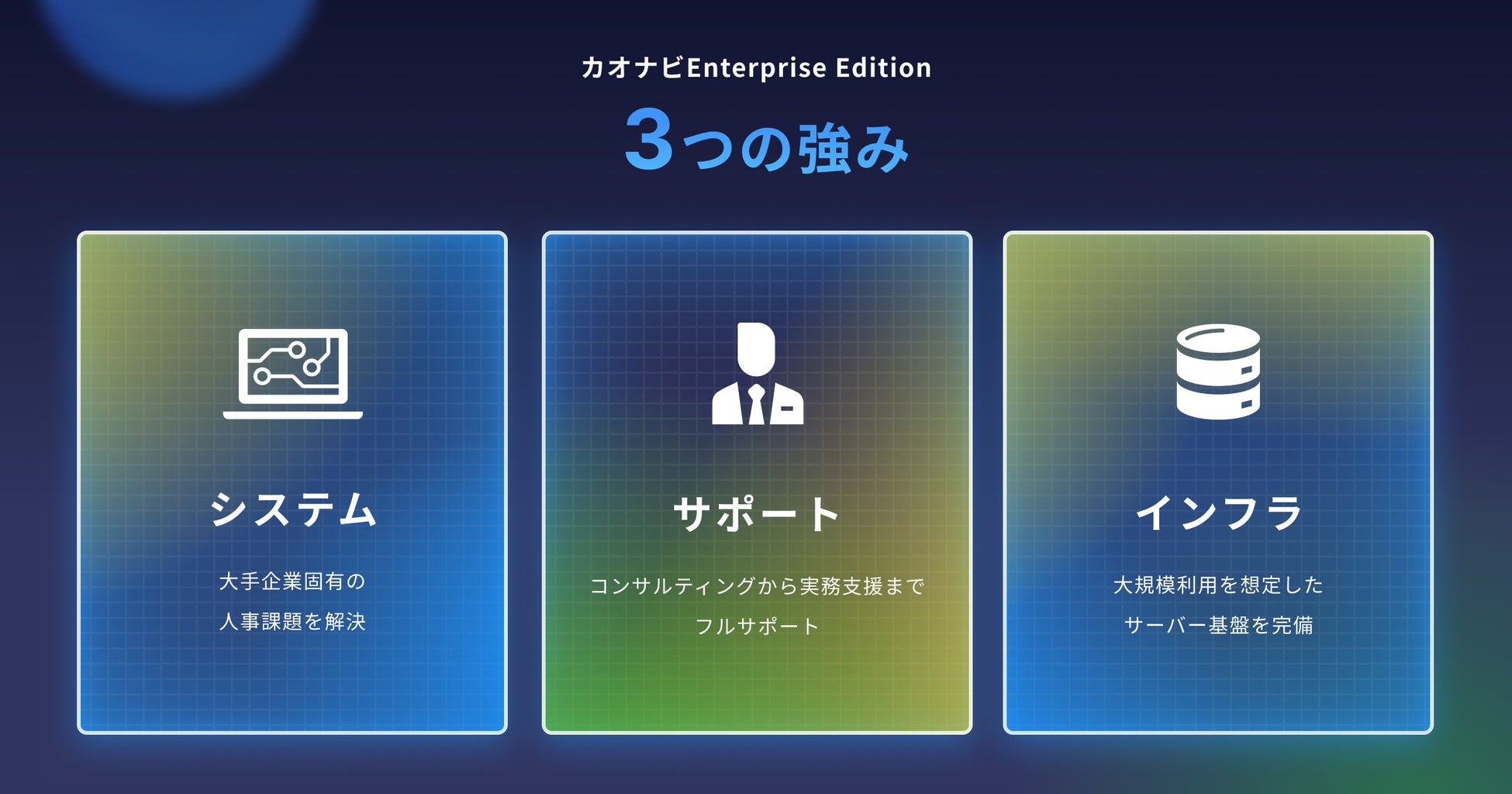 本サービスは、大手企業特化型のタレントマネジメントのオールインワンパッケージです。「カオナビ」の全ての機能から、人事課題解決に向けたコンサルティングサポート体制、大規模利用を想定したインフラ基盤までを盛り込み、大手企業固有の人事課題を解決していきます。