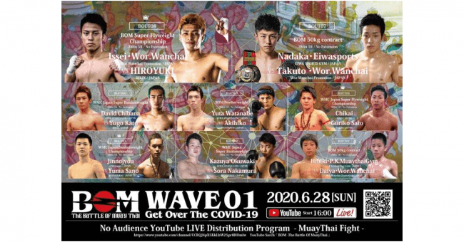 今回のライブ配信は、メインイベントに2019年の大会から新設されたBOMの王座を賭け、イッセイ・ウォーワンチャイ(石井一成)とHIROYUKIの対戦をはじめ、2019年12月にBOMフライ級(50kg)王座を獲得した名高・エイワスポーツジムと16歳の新鋭・タクト・ウォーワンチャイ(和田拓飛)との対戦を含めた、全16選手でオリジナルマッチを開催。解説に日本ムエタイ界の至宝と言われている「梅野源治」とLast BOMの愛称でお馴染みの「朝陽・PKセンチャイムエタイジム」を迎え、ムエタイの魅力と共に大会の一部始終を解説していただきます。さらに実況は、格闘技でおなじみの「清野茂樹」、リングアナウンサーは「UZI」でお届けします。