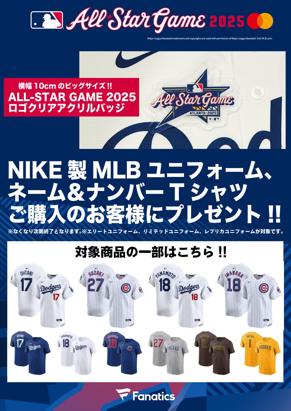 NIKE製MLBユニフォーム、ネーム&ナンバーTシャツご購入のお客様に、ALL-STAR GAME 2025 ロゴクリアアクリルバッジをプレゼント!
