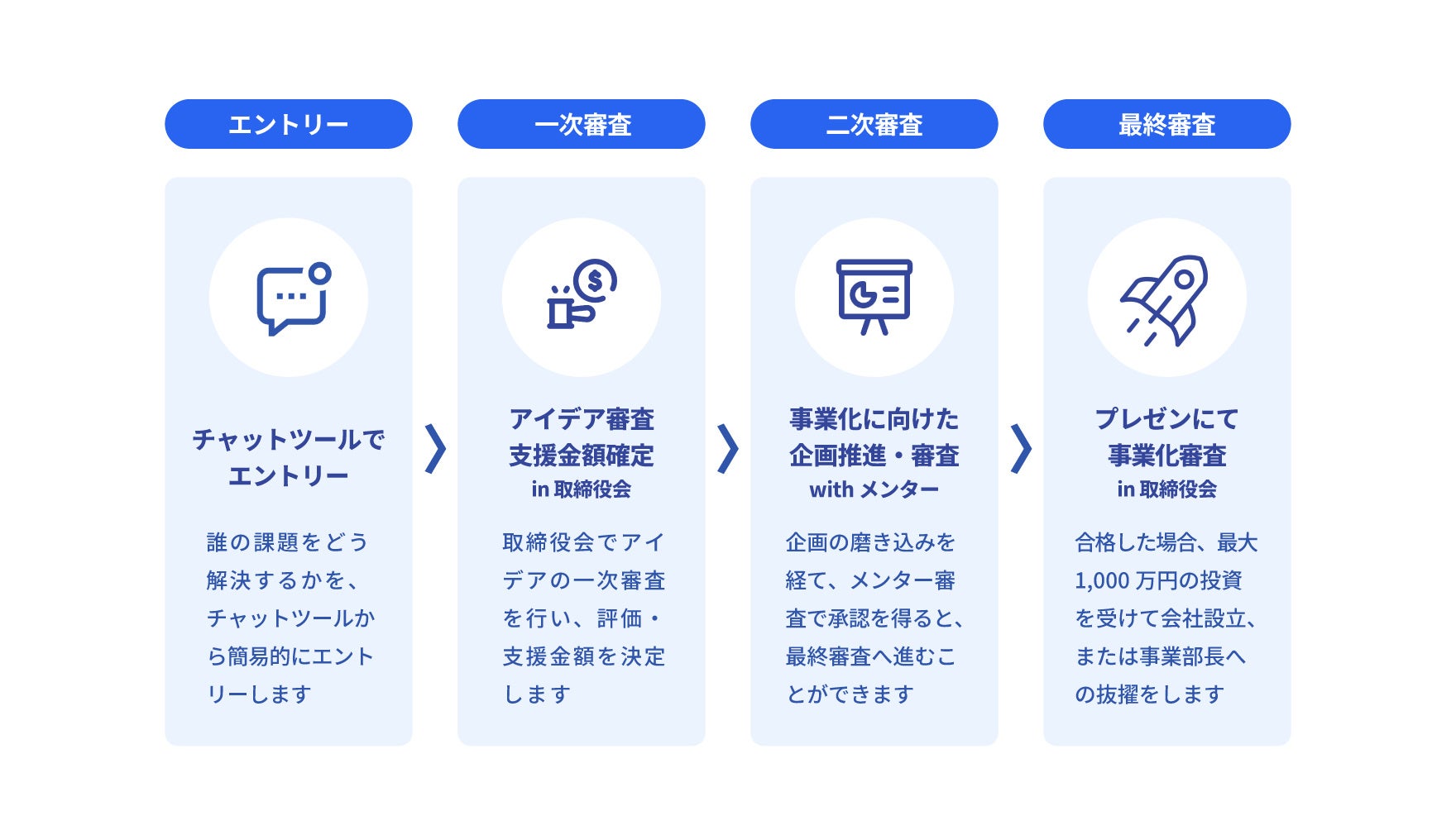 本制度は、社員一人ひとりの発想や課題意識を起点に、新規事業の創出に挑戦できる仕組みです。段階的な審査と育成を経て、最大1,000万円の投資を行い、事業化を支援します。