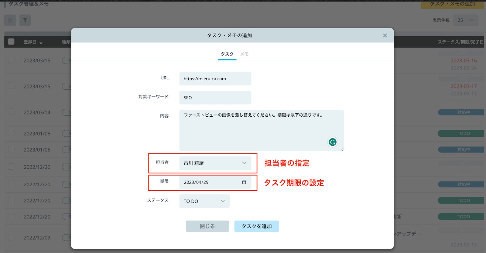 今回のバージョンアップでは、ミエルカSEOユーザーだけでなく、社内外メンバーにタスク管理用アカウントが発行可能になりました。各タスクは期限を設定し、担当者を選択してタスクを割り振ることができます。
