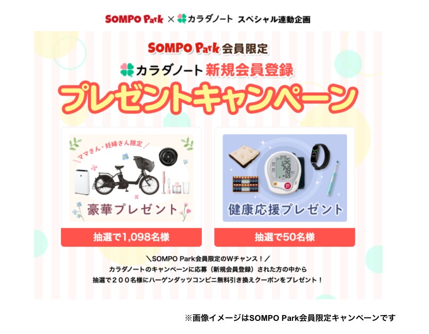 「家族の健康を支え笑顔をふやす」をビジョンとし、家族と向き合う全ての人のアシスタントとして心身ともに健康な生活を支援する事業会社である株式会社カラダノート(東京都港区/代表:佐藤竜也/以下当社)は、「すべての人々・地域・社会に、たくさんの笑顔と活力あふれる確かな明日をお届けする」をビジョンに掲げる損害保険ジャパン株式会社(東京都新宿区/代表:西澤敬二/以下損保ジャパン)と、両社の顧客基盤の拡大を目的とした相互集客による共同キャンペーン「SOMPO Park・カラダノートスペシャル連動企画 プレゼントキャンペーン」を2022年2月1日〜4月30日の期間で実施いたします。
