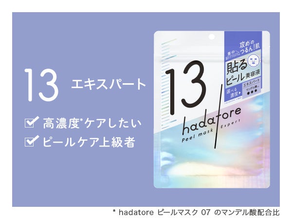 ごわつき・凹凸肌の角質をケアして“なめらかつるん肌”へと仕上げるシートマスクは、角質ケア効果のある浸透*1型ピールケア成分“マンデル酸*2”の濃度で選べる2つのラインナップ(「hadatore ピールマスク 07」「hadatore ピールマスク 13」) の展開となり、自分の肌に合わせたピールケアをお楽しみいただけます。