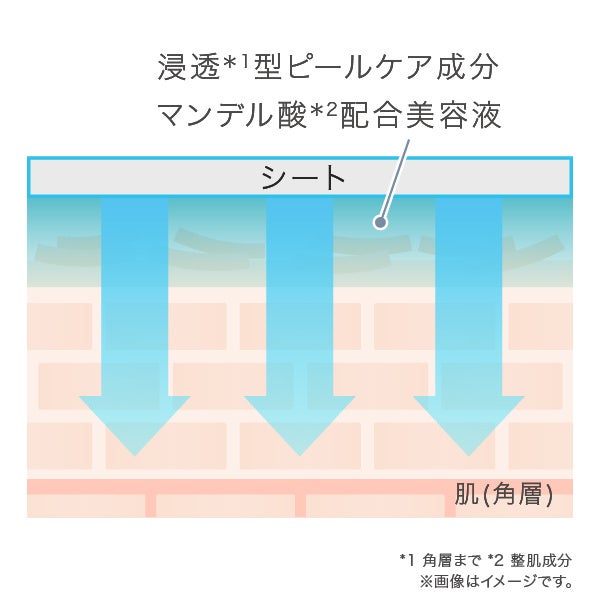 ごわつき・凹凸肌の角質をケアする浸透*1型ピールケア成分“マンデル酸*2”を配合。シートマスクだから成分が顔全体にムラなく浸透*1し、貼るだけで集中的に角質をケア。なめらかでキメの整った“つるん肌”へ導きます。