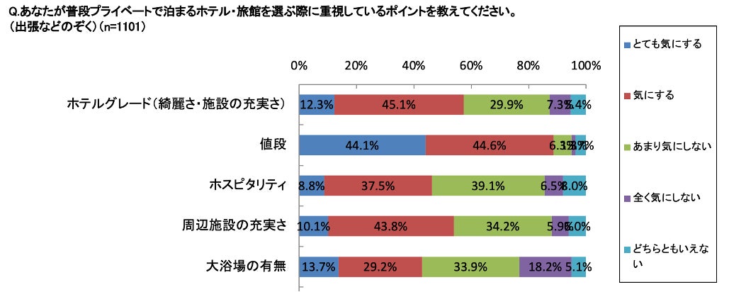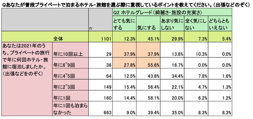 また、年に6 ~10回以上旅行をするリピーター層では、ホテルのグレード(綺麗さ・充実さ)を「とても気にする」「気にする」と答えた人は平均79.6%にもおよび、年5回以下の層が平均62.3%であったことと比べ、高い数値が出た。
