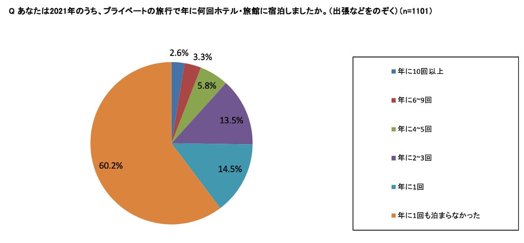 2021年にプライベートで宿泊した回数は、「0回」が半数を超えもっとも多く、次いで「年に1回」、「年に2~3回」…と回数が多くなるごとに割合が減っていく結果となった。2021年はコロナ蔓延当初に比べ行動の規制が徐々に緩和されつつあるものの、感染症による観光業への影響は未だ大きいことが分かった。