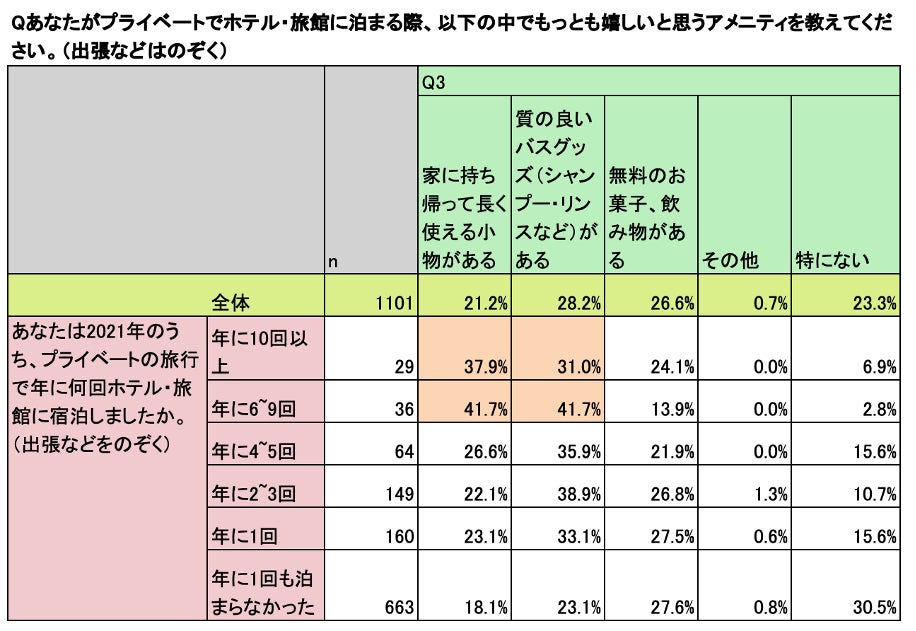 「家に持ち帰られるグッズ・質の良いバスグッズ・無料の飲食提供」において、どのカテゴリも大幅に人気の差はなかった。しかし年に6~10回以上旅行に訪れるリピーター層は無料の飲食提供よりも持ち帰られるグッズや質の良いバスグッズの人気が高く、「宿泊時に実際使用するグッズ」に特に注目していることが分かった。