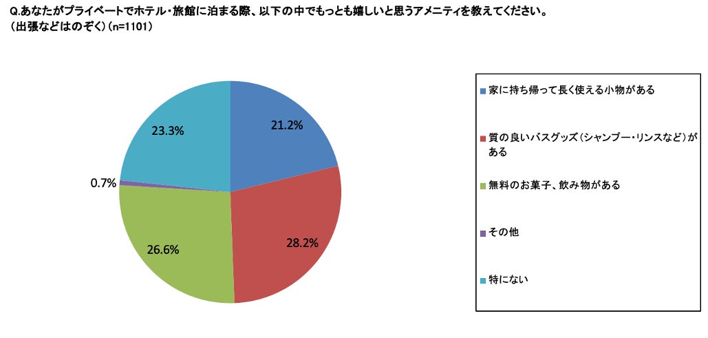 宿のアメニティに関する調査では、「家に持ち帰られるグッズ・質の良いバスグッズ・無料の飲食提供」において、どのカテゴリも大幅に人気の差はなかった。また、「特にない」と答えた人は他カテゴリと同等の割合でおり、全体としてアメニティの充実さは顧客満足度にあまり大きくは関与しないことが分かった。
