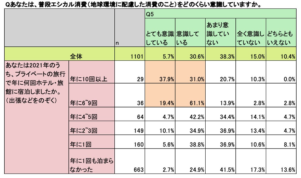 環境に配慮しているホテル旅館に対し、全体の71%が「印象が良い」と回答。また、年に6~10回以上旅行に訪れるリピーター層でエシカル消費(環境に配慮した消費行動)を普段意識する人は約74.7%と年5回以下の層に比べて高い数値となり、リピーター層の環境への意識の高さが伺えた。