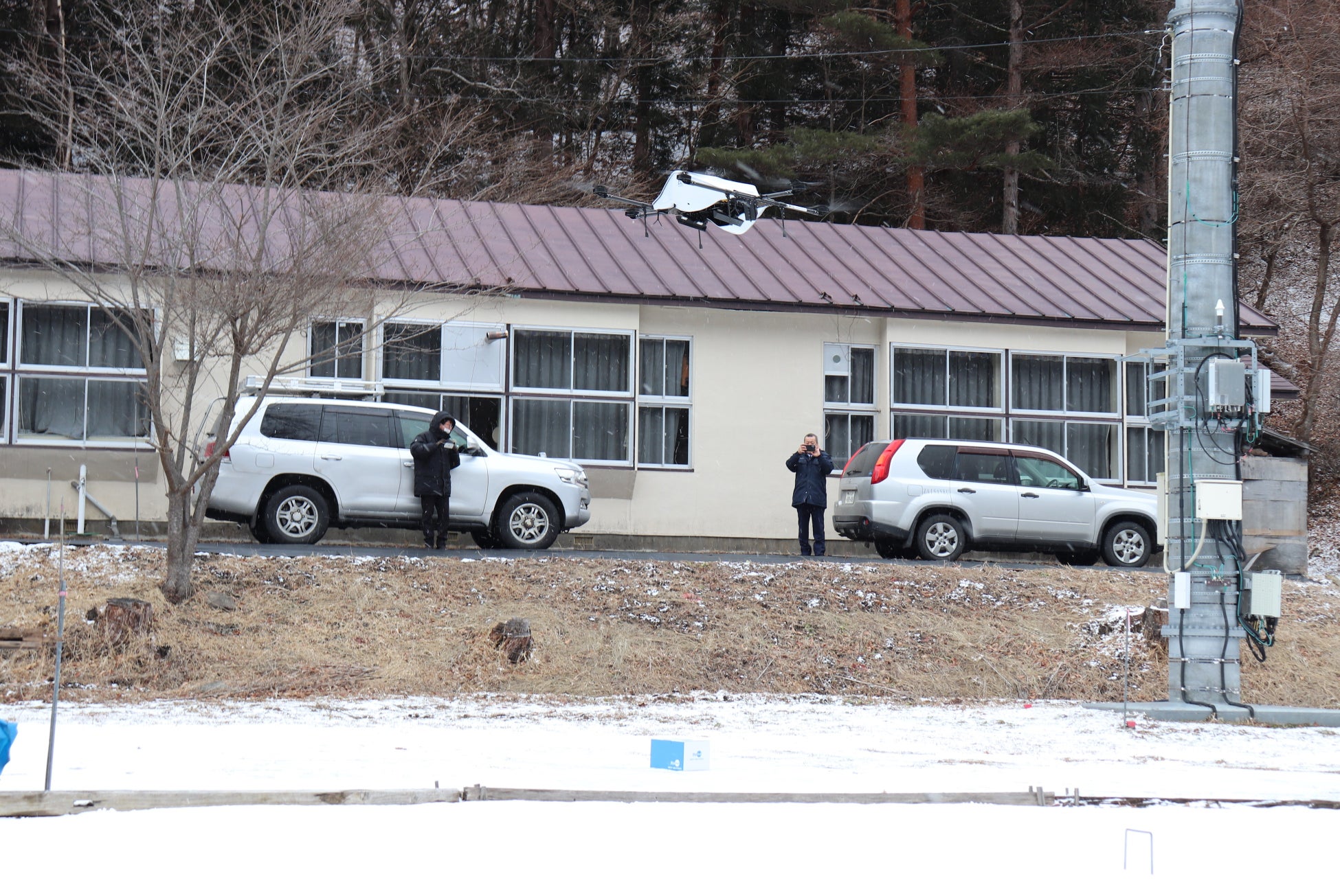 旧安家小学校まで届けられた岩泉ホールディングスの「岩泉ヨーグルト」と岩泉自動車運輸の宅配荷物(実証実験用)を混載してNEXT DELIVERYの運航するエアロネクストが開発した物流専用ドローンAirTruck*3に搭載し、松ケ沢公民館まで片道約4.2㎞を約10分でドローン配送しました。残りの荷物は陸送で配送場所までお届けしました。