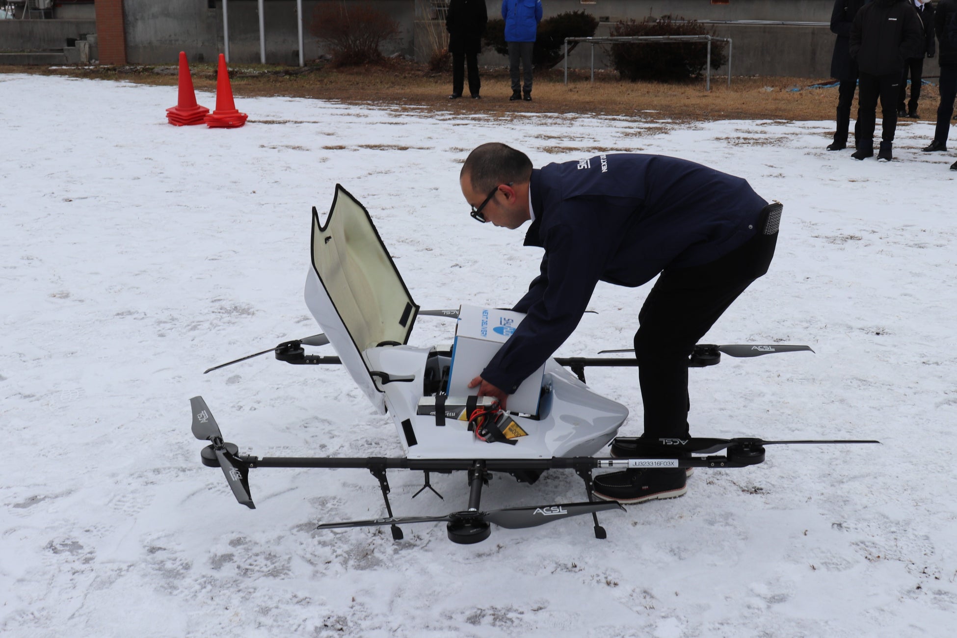 次世代ドローンのテクノロジースタートアップ、株式会社エアロネクストがACSLと共同開発した日本発の量産型物流専用ドローン。エアロネクスト独自の機体構造設計技術4D GRAVITY®*4により安定飛行を実現。荷物を機体の理想重心付近に最適配置し、荷物水平と上入れ下置きの機構で、物流に最適なユーザビリティ、一方向前進特化・長距離飛行に必要な空力特性を備えた物流用途に特化し開発した「より速く より遠く より安定した」物流専用機です。日本では各地の実証地域や実証実験で飛行しトップクラスの飛行実績をもち、海外ではモンゴルで標高1300m、外気温-15℃という環境下の飛行実績をもつ(2023年11月)。最大飛行距離20km、ペイロード(最大可搬重量)5kg.