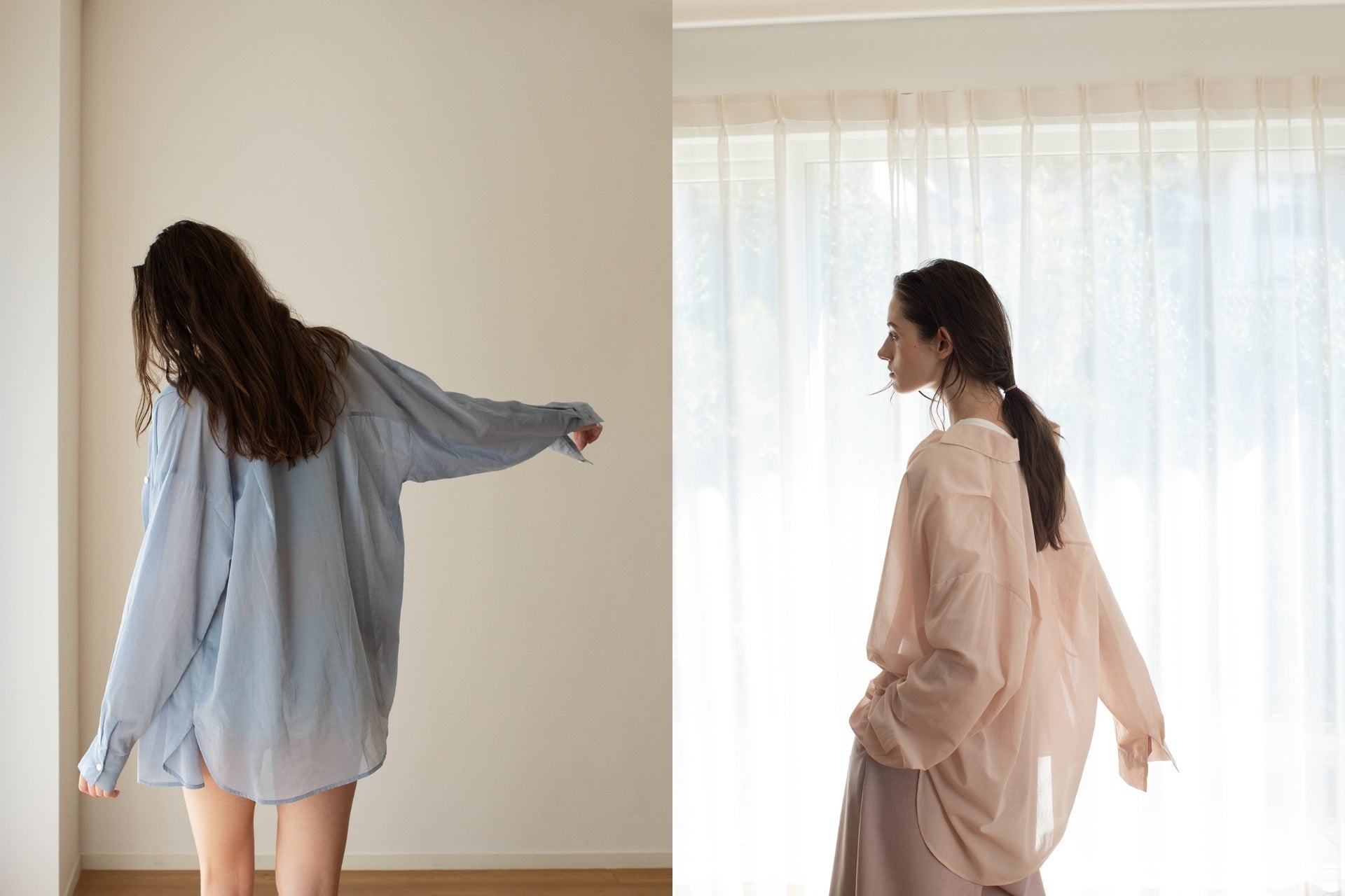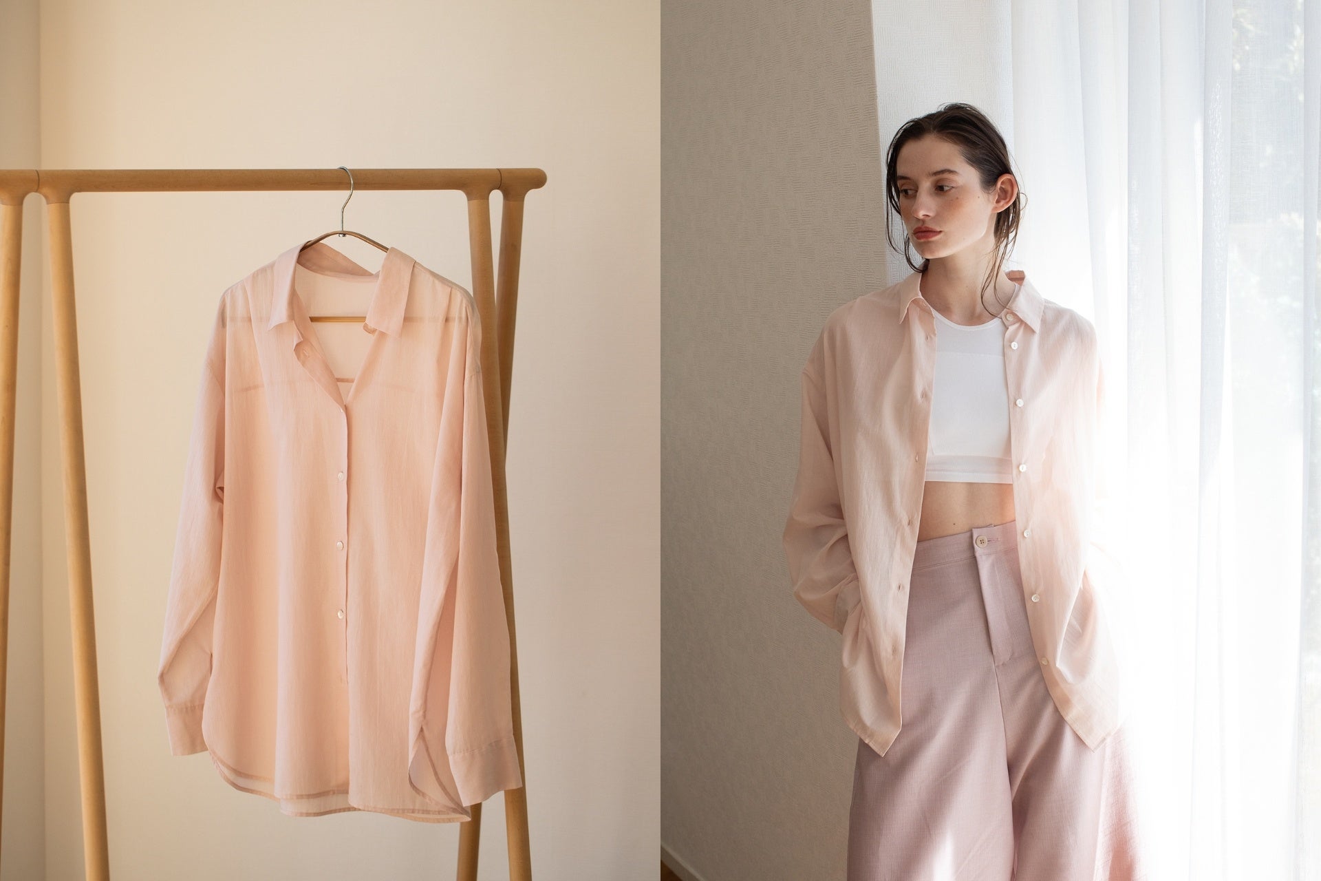 薄手で透け感のある、さらりとした肌触りの生地のシアーシャツ。ベーシックなデザインのため、肩を落としてリラックスした印象や、ボタンをしめたり、ボトムにインすることですっきりした印象にしたりなど、様々なスタイリングをお楽しみいただけます。また、中に合わせるインナーやトップスで表情が変わるのも魅力です。