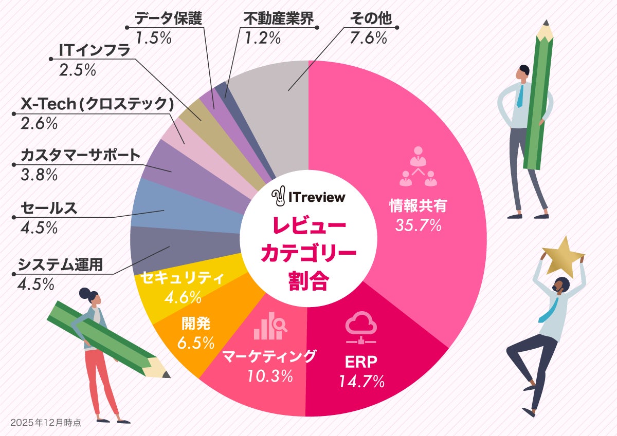 投稿されたレビューのうち、最も多い割合を占めるのが「情報共有」カテゴリーで、ビジネスチャットやオンライン会議、ストレージなど、日々のコミュニケーション基盤として欠かせない製品への評価が集まっています。