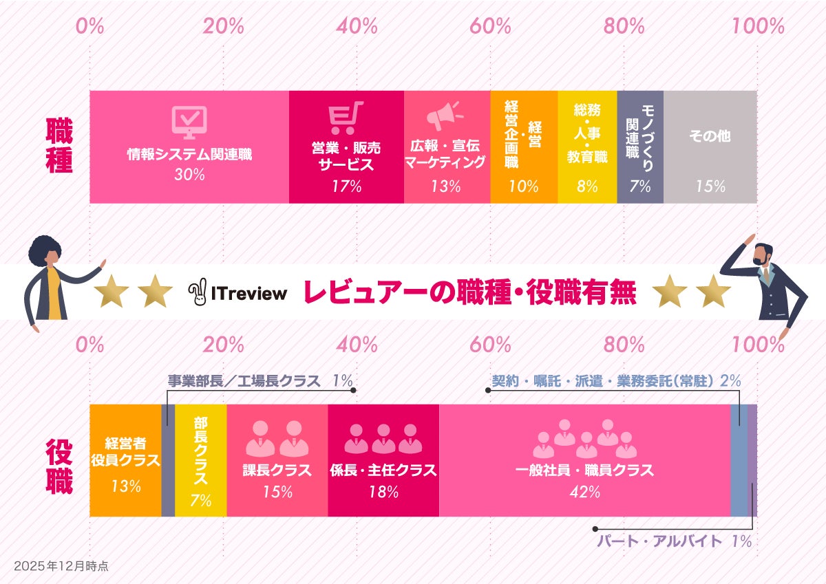 一般社員の投稿が約4割を占めるものの、課長、部長や経営者など役職者のレビューは5割を超えており、現場レベルから意思決定層までバランスよく評価が寄せられています。