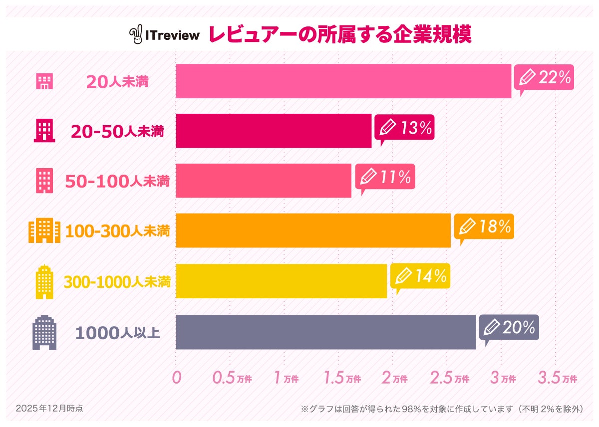 20名未満の企業から1,000名以上の大企業まで幅広い層からレビューが集まり、企業規模を問わず“リアルな体験談”が蓄積されています。