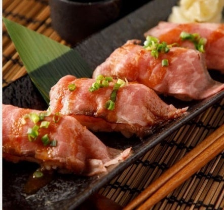 脂身が少なくさっぱりとしたローストビーフを寿司スタイルでご提供。あっさりとした酢飯と牛肉との相性が良い、甘辛だれとワサビが味にアクセントを加えます。